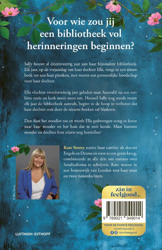 In De bibliotheek vol herinneringen van Kate Storey bouwt Sally al drieënveertig jaar lang aan haar bijzondere bibliotheek. Elk jaar, op de verjaardag van haar dochter Ella, voegt ze een nieuw boek toe aan haar planken, met voorin een persoonlijke boodschap voor haar dochter.