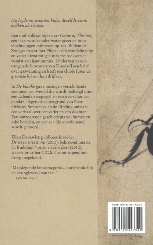 In 'De blanke gave' word je ondergedompeld in een wereld waar het water oprukt, moeders hun kinderen op het droge slepen en geliefden verdwijnen. De IKEA loopt onder en de A2 verandert in een heel kalm, groot kanaal: 'op de tekentafel rust een atlas/ alvast atlantisblauw gekrast.'