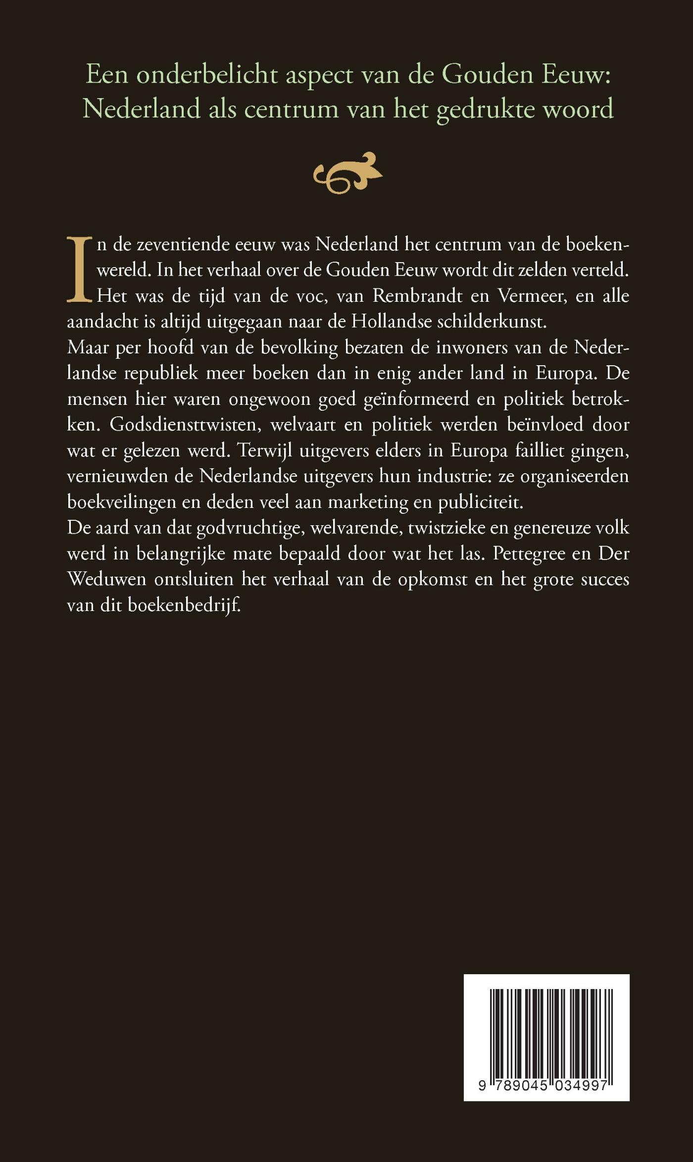 In ‘De boekhandel van de wereld’ vertellen Andrew Pettegree en Arthur der Weduwen het verhaal van de opkomst en het grote succes van het bloeiende zeventiende-eeuwse Nederlandse boekenbedrijf. In de zeventiende eeuw was Nederland het centrum van de boekenwereld. In het verhaal over de Gouden Eeuw wordt dit zelden verteld. Het was de tijd van de voc, van Rembrandt en Vermeer, en alle aandacht is altijd uitgegaan naar de Hollandse schilderkunst. Maar per hoofd van de bevolking bezaten de inwoners van de Nederlandse republiek meer boeken dan in enig ander land in Europa. De mensen hier waren ongewoon goed geïnformeerd en politiek betrokken. Godsdiensttwisten, welvaart en politiek werden beïnvloed door wat er gelezen werd. Terwijl uitgevers elders in Europa failliet gingen, vernieuwden de Nederlandse uitgevers hun industrie: ze organiseerden boekveilingen en deden veel aan marketing en publiciteit. De aard van dat godvruchtige, welvarende, twistzieke en genereuze volk werd in belangrijke mate bepaald door wat het las.