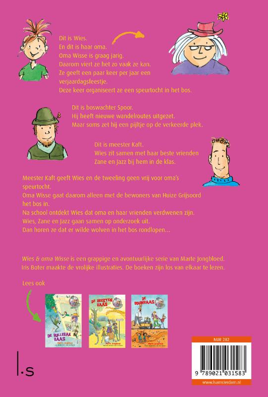 In De bosbaas van Marte Jongbloed en Iris Boter (ill.) gaat Wies op zoek naar oma Wisse, die in het bos is verdwaald. Een toegankelijke, vrolijke avonturenserie voor lezers die nog niet zo lang lezen. Eerder verschenen De bullebakbaas, De beestenbaas en De bouwbaas. De delen zijn los van elkaar te lezen en staan boordevol fullcolourillustraties.