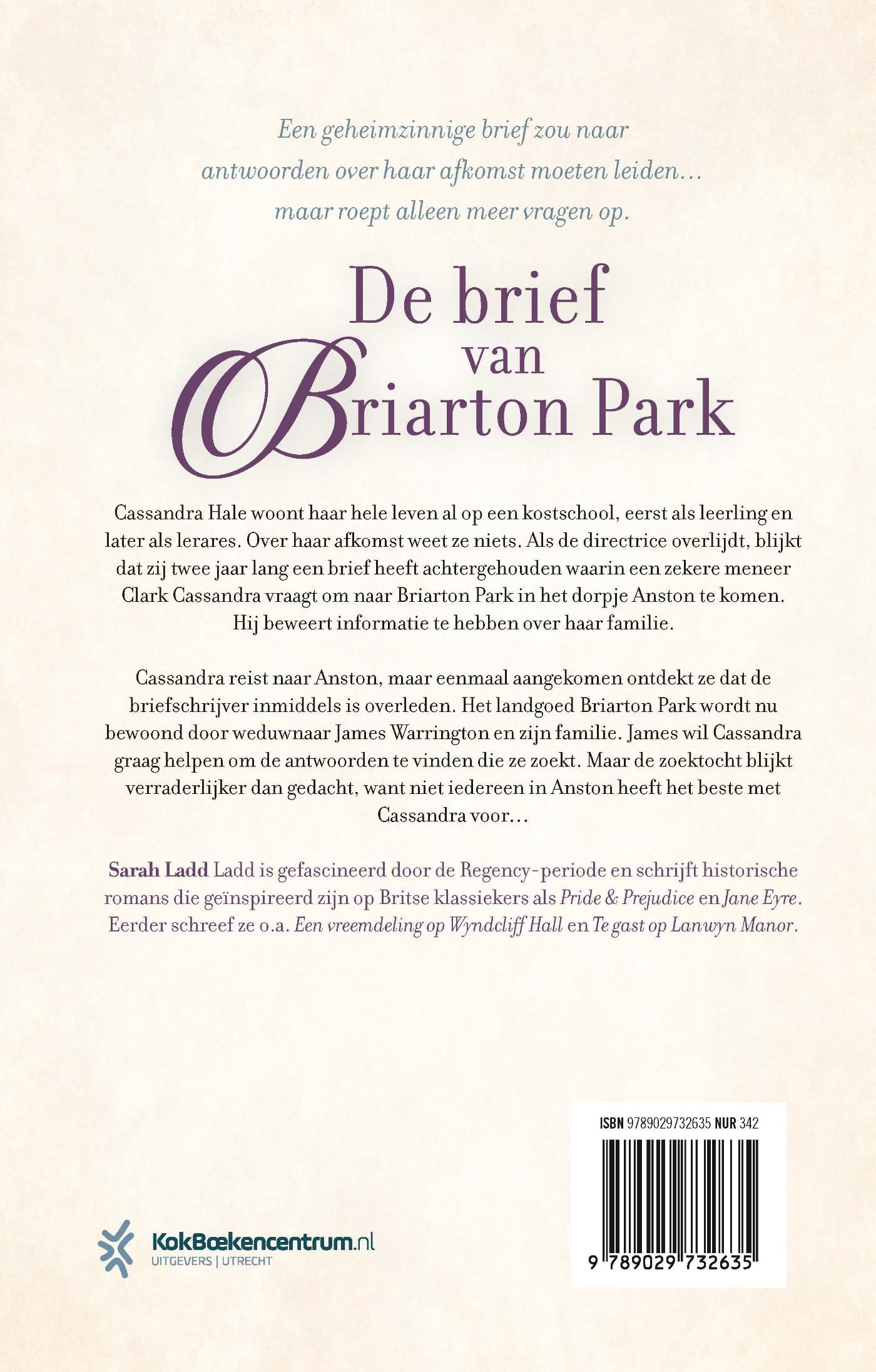 De brief van Briarton Park van Sarah Ladd is een spannende Regency-roman waarin de jonge Cassandra een geheimzinnige brief ontvangt die haar hele leven op zijn kop zet. Ze heeft altijd als wees in een kostschool gewoond en weet niet veel van haar ouders. Als de directrice van de kostschool overlijdt, krijgt Cassandra de brief in handen, waarin haar gevraagd wordt naar Briarton Park te komen. Cassandra bedenkt zich geen moment en reist ernaartoe, maar als ze aangekomen is, treft ze een weduwnaar met twee dochters, zijn zus en zijn schoonmoeder in plaats van de briefschrijver. Samen met de weduwnaar raakt ze verstrikt in het oplossen van een moordzaak, waarop hij probeert haar te helpen met het vinden van de antwoorden op de vragen waarmee ze naar Briarton Park is gekomen. De zoektocht naar antwoorden levert meer op dan Cassandra ooit had durven dromen.