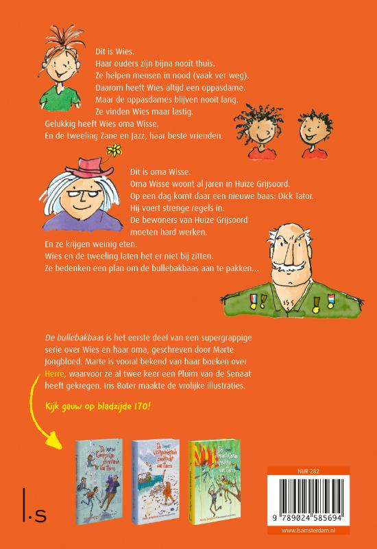 Wies en oma Wisse – De bullebakbaas is het eerste deel van een toegankelijke serie van Pluim-winnares Marte Jongbloed (bekend van Herre) voor kinderen vanaf 6 jaar. In deze supergrappige serie, met fullcolour illustraties van Iris Boter, redt Wies haar oma van een gemene directeur.