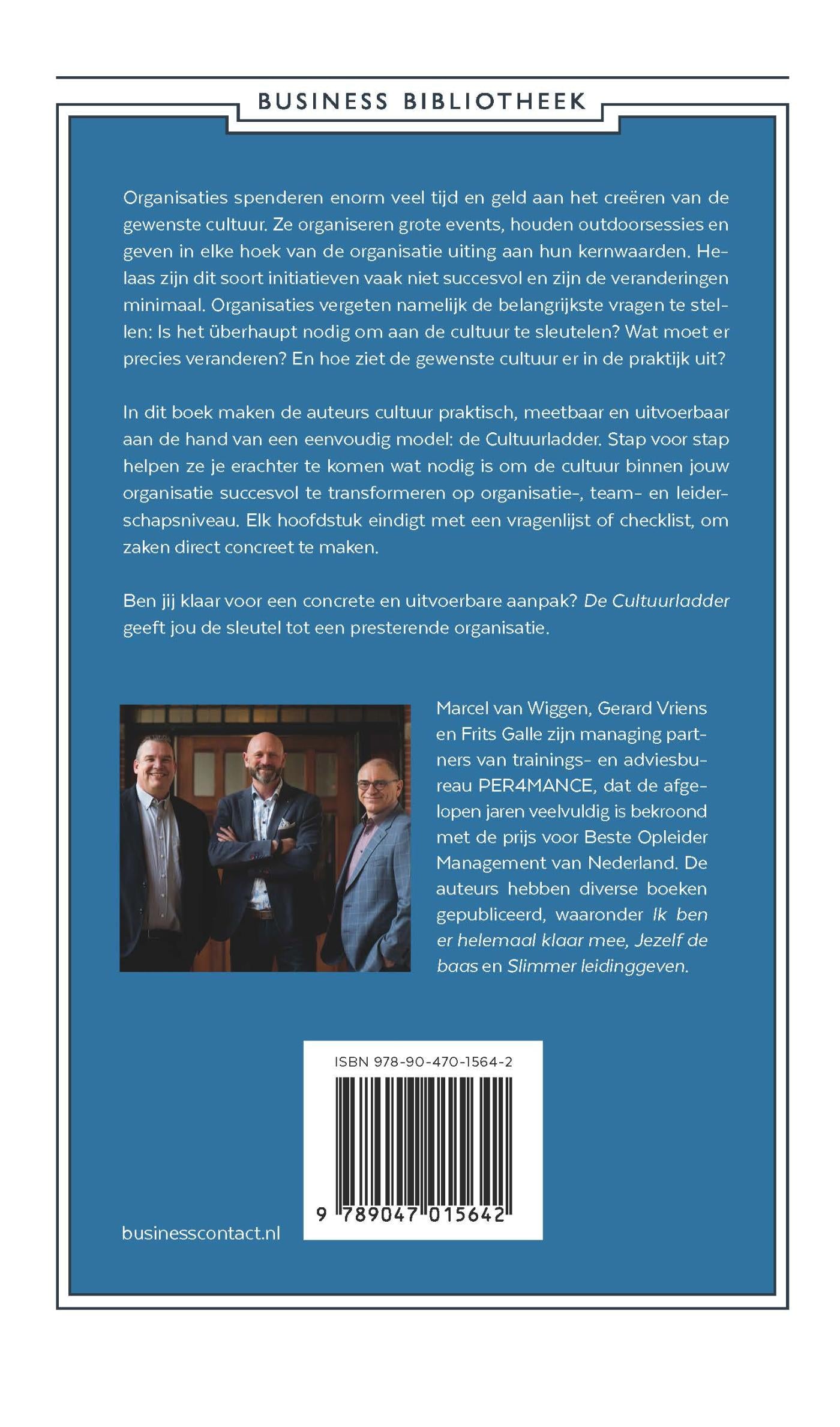 Cultuur praktisch, meetbaar en uitvoerbaar gemaakt aan de hand van een eenvoudig model: de Cultuurladder. Organisaties spenderen enorm veel tijd en geld aan het creëren van de gewenste cultuur, ze organiseren grote events, houden outdoorsessies en geven in elke hoek van de organisatie uiting aan hun kernwaarden. Helaas zijn dit soort initiatieven vaak niet succesvol en zijn de veranderingen minimaal. Organisaties vergeten namelijk de belangrijkste vragen te stellen: Is het überhaupt nodig om aan de cultuur te sleutelen? Wat moet er precies veranderen? En hoe ziet de gewenste cultuur er in de praktijk uit?