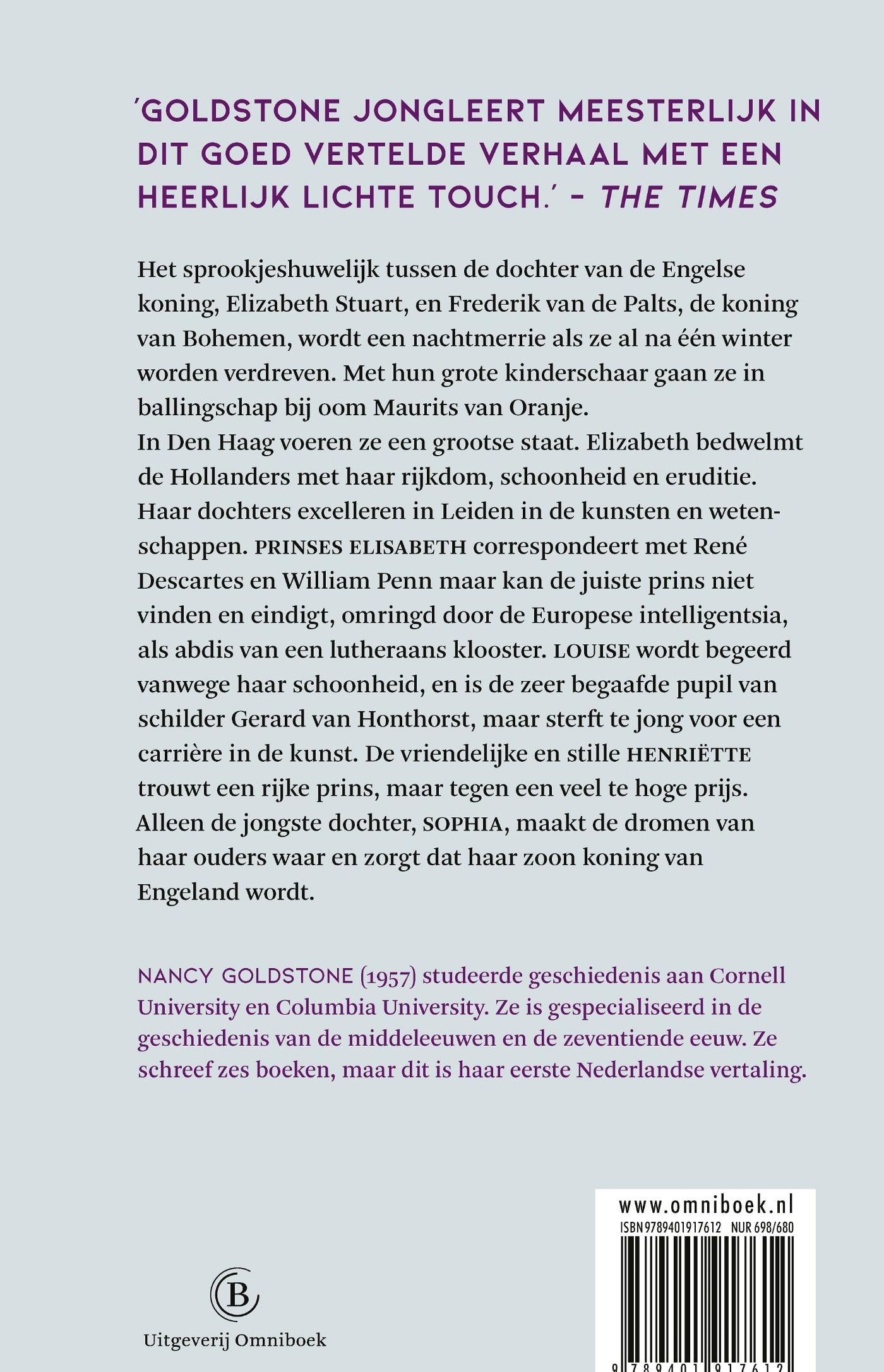 ‘De dochters van de Winterkoningin’ van Nancy Goldstone is een geschiedenisverhaal over vier prinsessen in ballingschap. Het sprookjeshuwelijk tussen Elizabeth, de kleindochter van de Schotse koningin Mary Stuart en Frederik van de Palts, de koning van Bohemen, loopt uit op een nachtmerrie als zij na één jaar al verdreven worden. Het kinderrijke gezin gaat in ballingschap in Den Haag bij oom Maurits van Oranje-Nassau, in 2021 precies 400 jaar geleden. De dertien kinderen worden in Leiden opgevoed in de kunsten en wetenschappen. In ‘De dochters van de Winterkoningin’ vertelt Nancy Goldstone op levendige wijze het opzienbarende verhaal van vier van Elizabeth Stuarts dochters: Elizabeth, Lousia, Henrietta Maria en en Sophie, die de loop van de geschiedenis bepaalden.