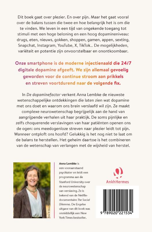 In 'De dopamine factor' laat Anna Lembke aan de hand van de laatste wetenschappelijke ontdekkingen zien wat dopamine met ons doet en waarom ons brein verslaafd wil zijn. We zijn continu op zoek naar de volgende fix en rusten niet voordat we weer beloond worden. Sterker nog: we willen dat gevoel nooit meer kwijtraken.