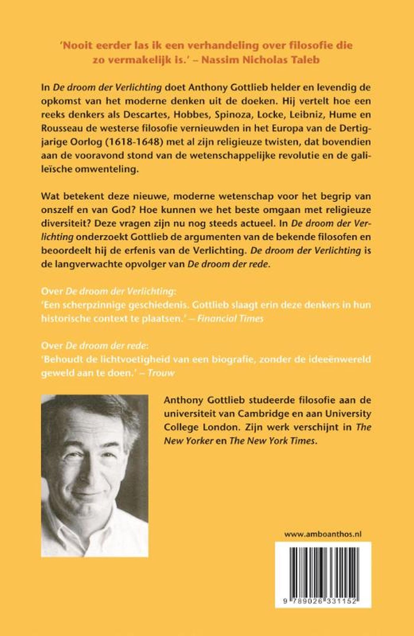 In ‘De droom der Verlichting’ van Anthony Gottlieb, het tweede deel van zijn tweeluik over de geschiedenis van de filosofie, behandelt de opkomst van het moderne denken. In anderhalve eeuw tijd vernieuwden een reeks amateurs als Descartes, Hobbes, Spinoza, Locke, Leibniz, Hume en Rousseau de westerse filosofie in het Europa van de Dertigjarige Oorlog met al zijn religieuze twisten. Wat betekent deze nieuwe, moderne wetenschap voor het begrip van onszelf en van God? Hoe kunnen we het beste omgaan met religieuze diversiteit? Deze vragen zijn anno nu nog steeds actueel. Met ‘De droom der rede’ en ‘De droom der Verlichting’ geeft Gottlieb de totale geschiedenis van de filosofie een nieuw gezicht. Nooit eerder is dit verhaal zo helder, zo toegankelijk, zo up-to-date verteld.