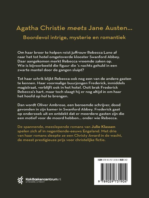 De echo van Swanford Abbey van Julie Klassen is een Regency-roman boordevol mysterie, intrige en romantiek. Wanneer Rebecca Lane afreist naar het tot hotel omgetoverde Swanford Abbey, kan ze niet vermoeden dat ze daar Sir Frederick tegen zal komen, de man die ooit haar hart brak. En ze had al helemaal niet kunnen raden dat Swanford Abbey het decor zou worden van de moord op een beroemde schrijver. Sir Frederick gaat op onderzoek uit en ontdekt dat er meerdere gasten zijn die een motief voor de moord hebben, onder wie Miss Lane…