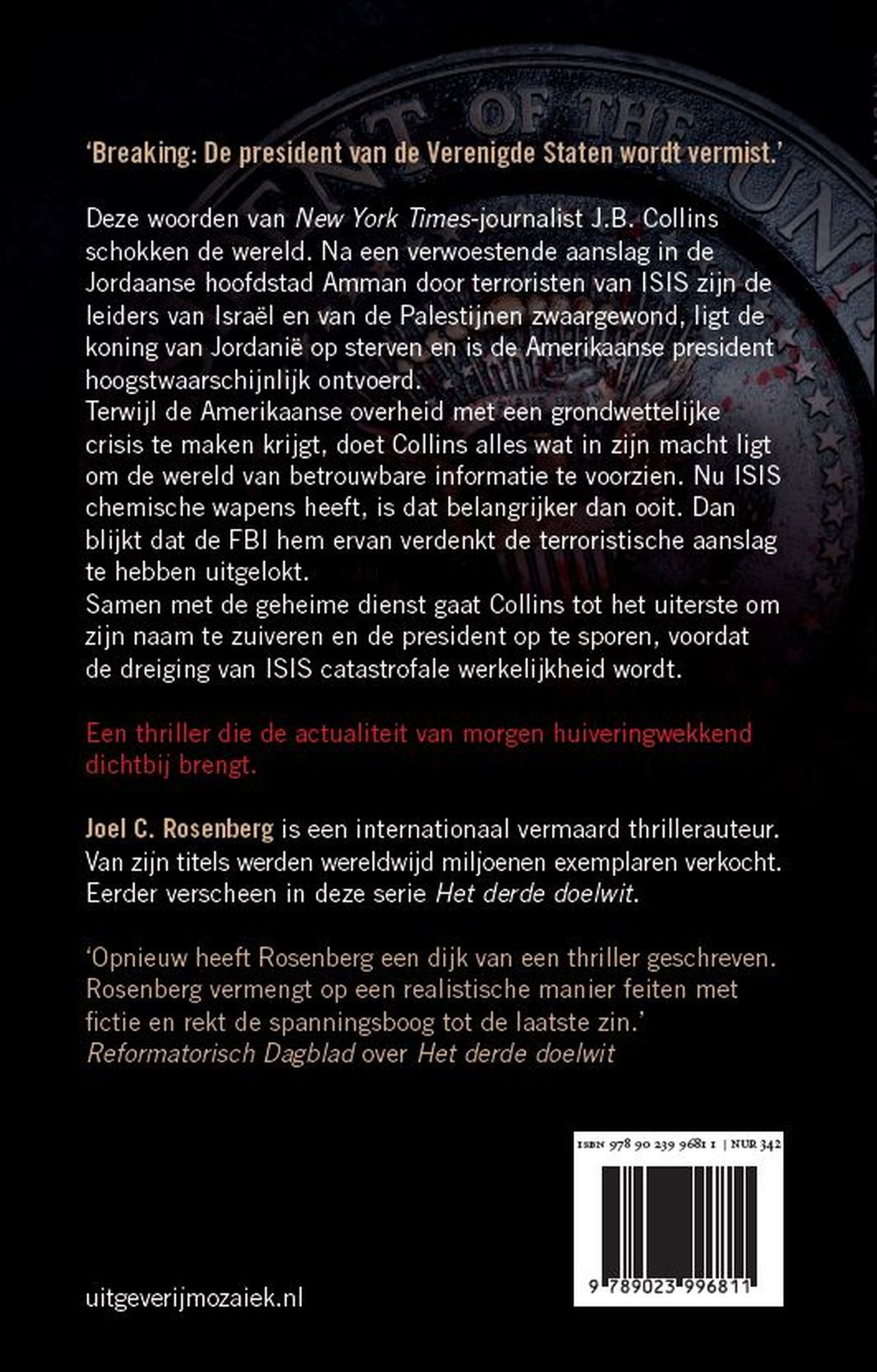 Met die woorden doet journalist J.B Collins van de New York Times de wereld verstijfd staan na een verwoestende aanslag door terroristen van ISIS in Amman, Jordanië. De leiders van Israël en van de Palestijnen zijn zwaargewond, de koning van Jordanië ligt op sterven en de vermiste Amerikaanse president is hoogstwaarschijnlijk ontvoerd.