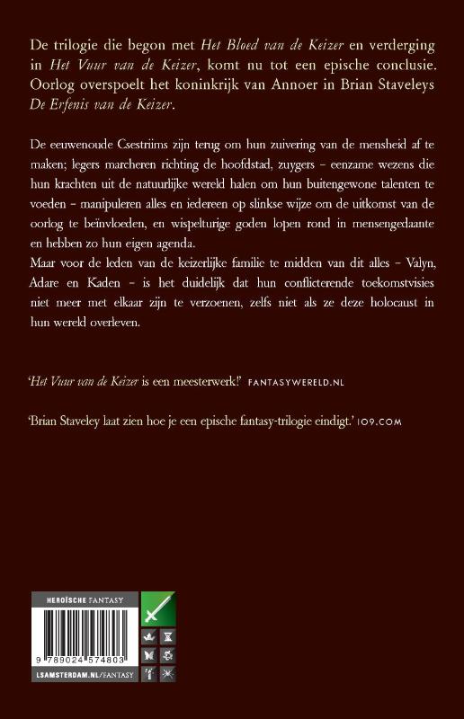 De Erfenis van de Keizer is het derde en laatste deel van de trilogie van auteur Brian Staveley die begon met Het Bloed van de Keizer en Het Vuur van de Keizer.