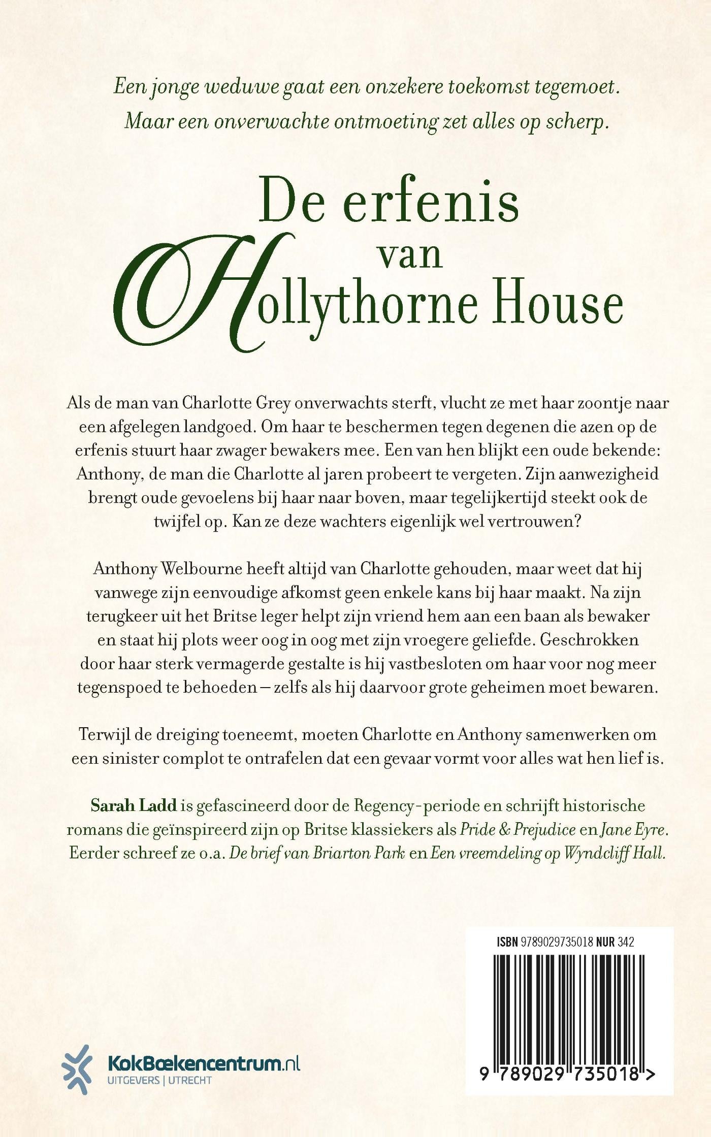 ‘De erfenis van Hollythorne House’ van Sarah Ladd is een meeslepende historische roman over een weduwe met een onzekere toekomst die een tweede kans krijgt in de liefde. Als Charlottes man onverwachts sterft, vlucht ze met haar jonge zoontje naar een afgelegen landgoed om hem te beschermen tegen haar schoonfamilie, die aast op haar erfenis. Haar voormalige zwager laat hen niet zomaar gaan en stuurt bewakers achter Charlotte aan om haar in de gaten te houden. Dan blijkt een van de bewakers een oude bekende te zijn: Anthony Welbourne, de man die Charlotte al jaren probeert te vergeten. Ze staat voor een moeilijke keuze: Anthony vertrouwen of alles wat haar dierbaar is op het spel zetten.