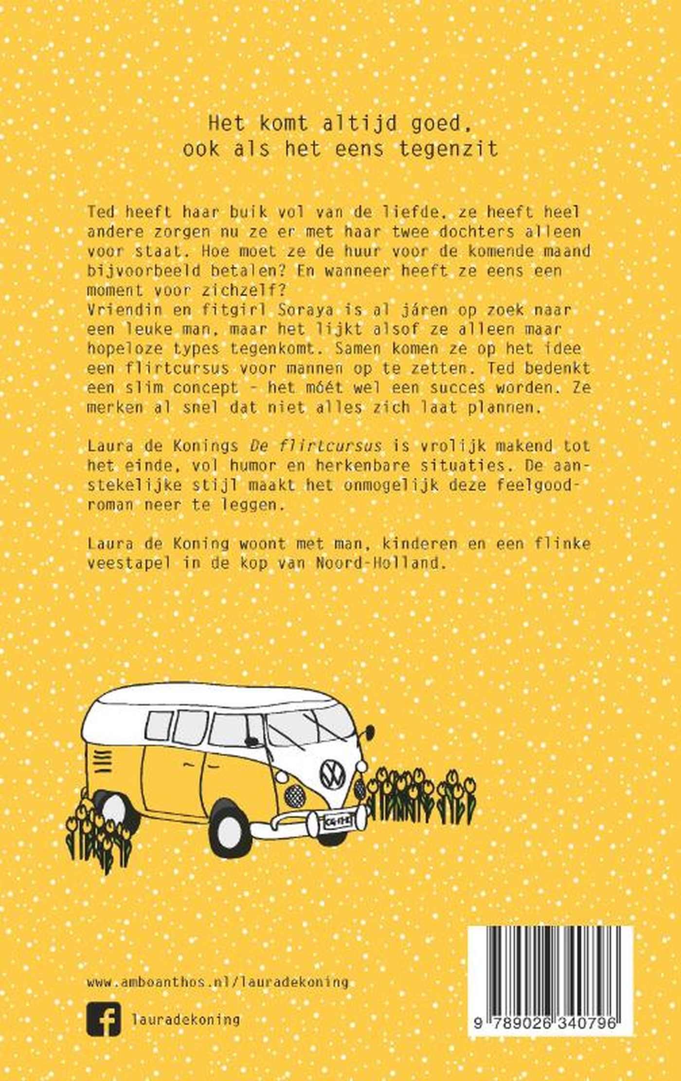 In ‘De flirtcursus’ van Laura de Koning heeft Ted haar buik vol van de liefde, ze heeft heel andere zorgen nu ze er met haar twee dochters alleen voor staat. Hoe moet ze de huur voor de komende maand bijvoorbeeld betalen? En wanneer heeft ze eens een moment voor zichzelf? Vriendin en fitgirl Soraya is al járen op zoek naar een leuke man, maar het lijkt alsof ze alleen maar hopeloze types tegenkomt. Samen komen ze op het idee om een flirtcursus voor mannen op te zetten. Ted bedenkt een slim concept, het móét wel een succes worden. Dat niet alles zich laat plannen, merken ze allebei al snel. Laura de Konings ‘De flirtcursus’ is vrolijkmakend tot het einde, vol humor en