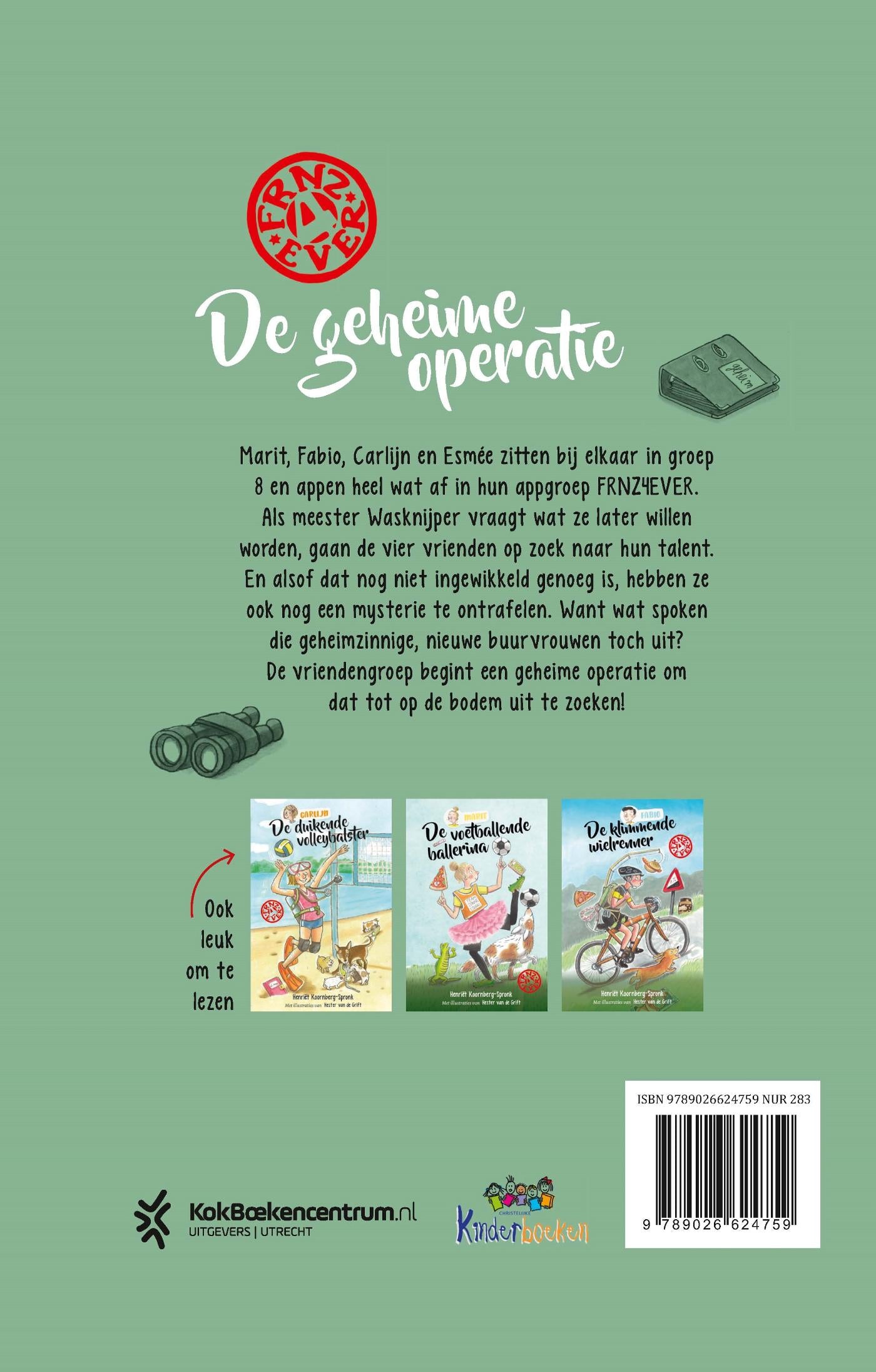Marit, Fabio, Carlijn en Esmée vormen al jarenlang een hechte vriendengroep. Ze zitten bij elkaar in groep 8 en appen heel wat af in hun appgroep FRNZ4EVER. In dit nieuwe, zelfstandig te lezen deel van de serie gaan de vier vrienden op zoek naar hun talent: wat willen ze later worden? En alsof dat nog niet ingewikkeld genoeg is, hebben ze ook nog een mysterie te ontrafelen. Want wat spoken die geheimzinnige, nieuwe buurvrouwen toch uit? De vriendengroep begint een geheime operatie om dat tot op de bodem uit te zoeken!