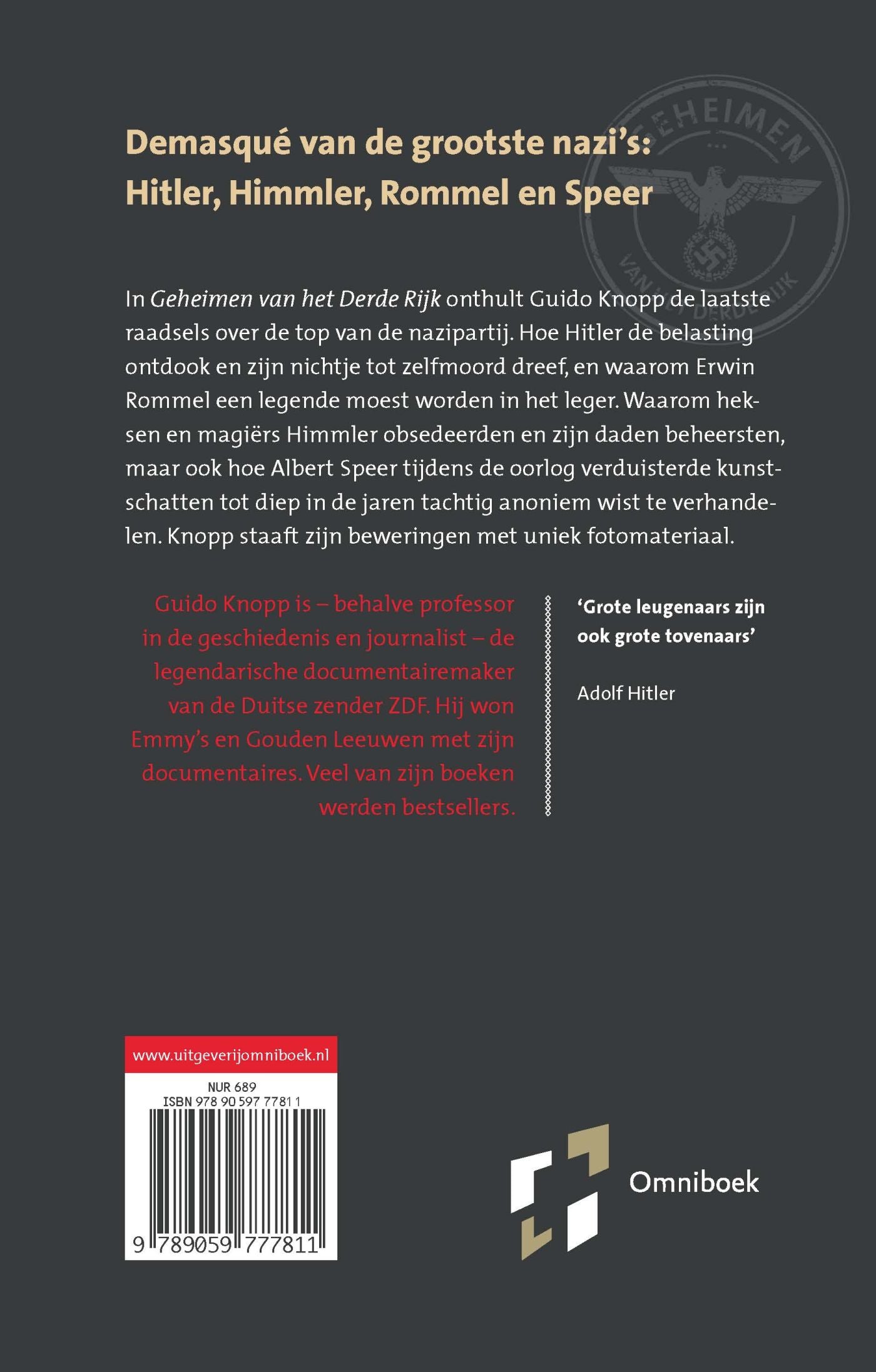 Schokkende onthullingen over nazikopstukken in 'De geheimen van het Derde Rijk'. Dit boek beschrijft het finale demasqué van de nazioorlogsmisdadigers. Dat het schurken en misdadigers waren, weet iedereen wel. Maar Guido Knopp onthult de laatste raadsels over de top van de nazipartij. Hoe Hitler de belasting ontdook en zijn nichtje tot zelfmoord dreef, waarom heksen en magiërs Himmler obsedeerden en zijn daden beheersten, waarom Erwin Rommel een legende moest worden in de Wehrmacht en hoe Albert Speer verborgen naz-kunstschatten tot diep in de jaren tachtig wist te verhandelen. Guido Knopp onthult in 'De geheimen van het Derde Rijk' feiten en foto's die destijds onbekend waren.