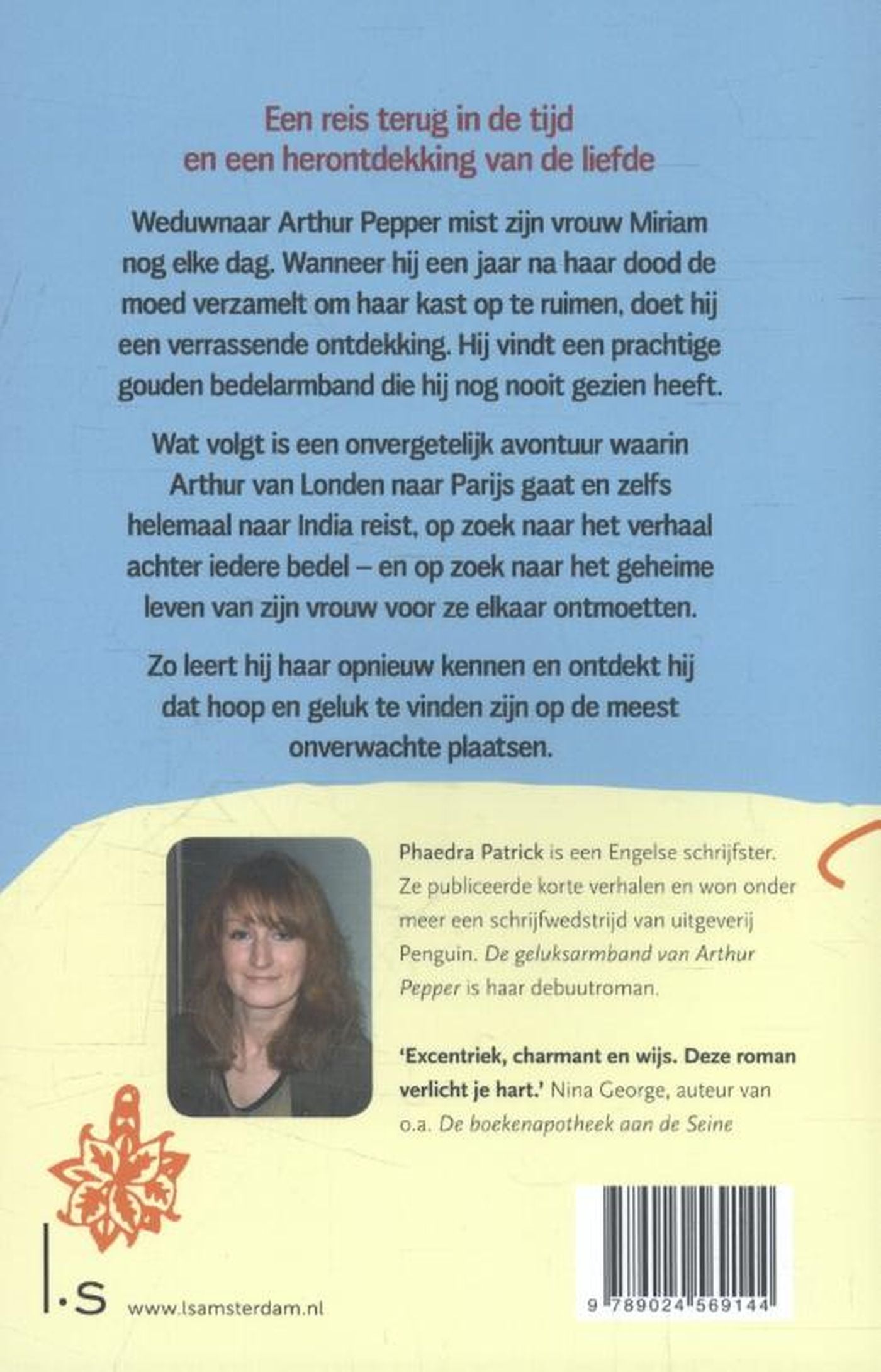 De geluksarmband van Arthur Pepper van Phaedra Patrick is een ontroerende feelgoodroman over een weduwnaar die zijn vrouw opnieuw leert kennen na de vondst van een prachtige bedelarmband. Een aanrader voor wie De boekenapotheek aan de Seine of De onwaarschijnlijke reis van Harold Frye heeft gelezen.