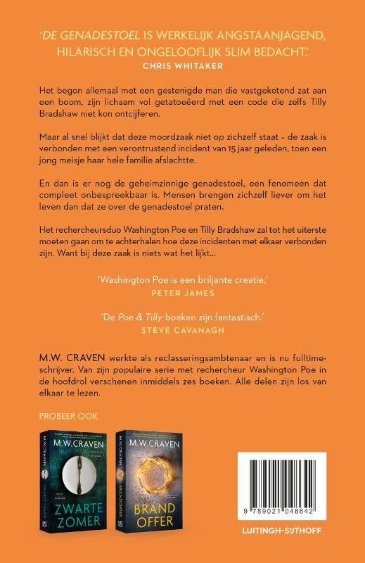 Keer terug naar de spannende wereld van het succesvolle rechercheursduo Washington Poe en Tilly Bradshaw in De genadestoel, het zesde deel in de bestsellerserie van M.W. Craven. Het begon allemaal met een gestenigde man die vastgeketend zat aan een boom, zijn lichaam vol getatoeëerd met een code die zelfs Tilly Bradshaw niet kon ontcijferen. Maar deze moordzaak staat niet op zichzelf en is verbonden met een verontrustend incident 15 jaar geleden: toen slachtte een meisje haar hele familie af. Dan is er nog de geheimzinnige genadestoel, een fenomeen dat onbespreekbaar is en mensen aanzet tot zelfmoord. Het rechercheursduo Poe en Bradshaw zal tot het uiterste moeten gaan om te achterhalen hoe deze incidenten met elkaar verbonden zijn. Maar bij deze zaak is niets wat het lijkt…
