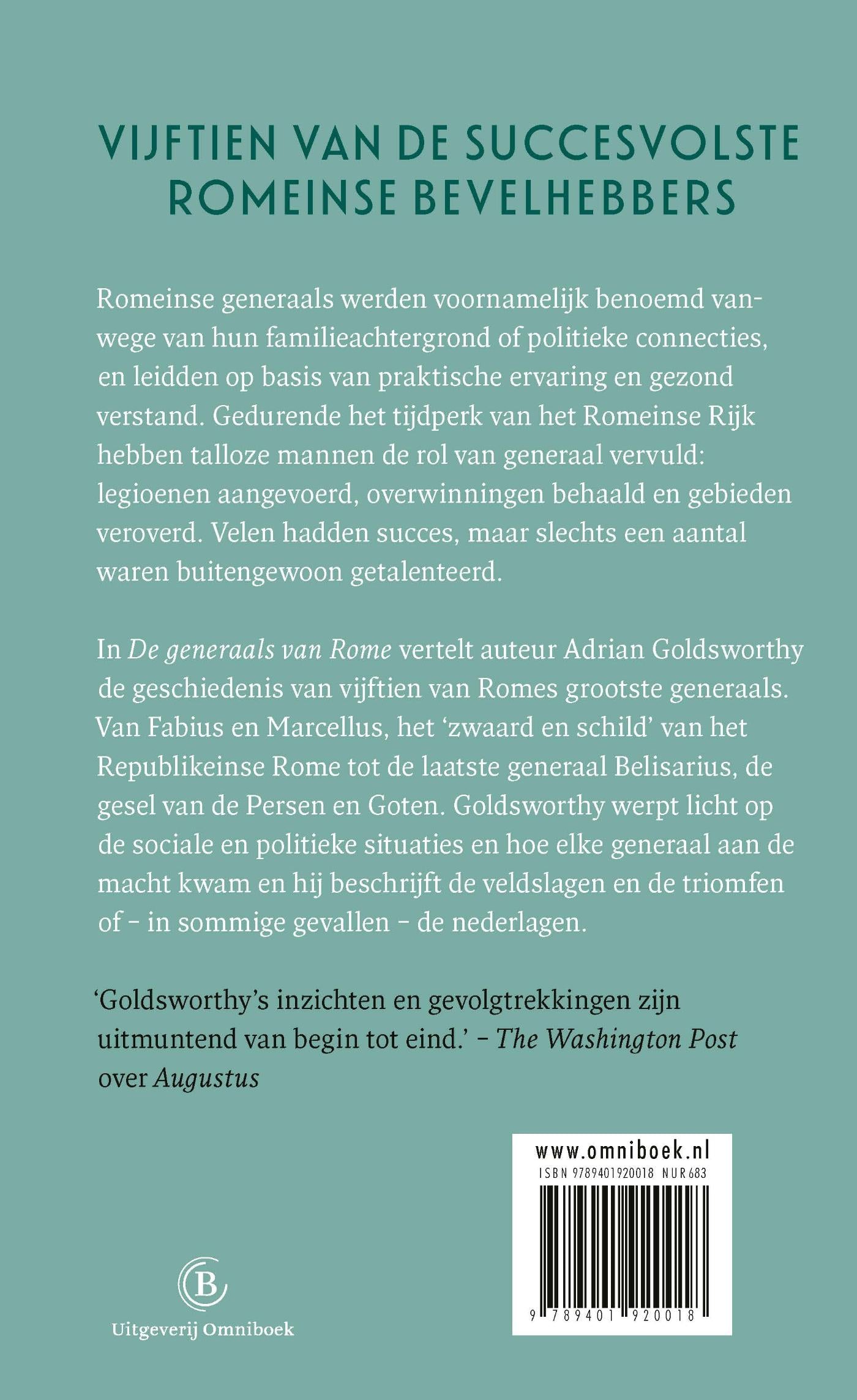 In ‘De generaals van Rome’ beschrijft de bekende historicus Adrian Goldsworthy de geschiedenis van vijftien van de succesvolste Romeinse bevelhebbers ooit, zoals Fabius en Marcellus, het ‘zwaard en schild’ van het Republikeinse Rome, en Belisarius, de gesel van de Persen en Goten.