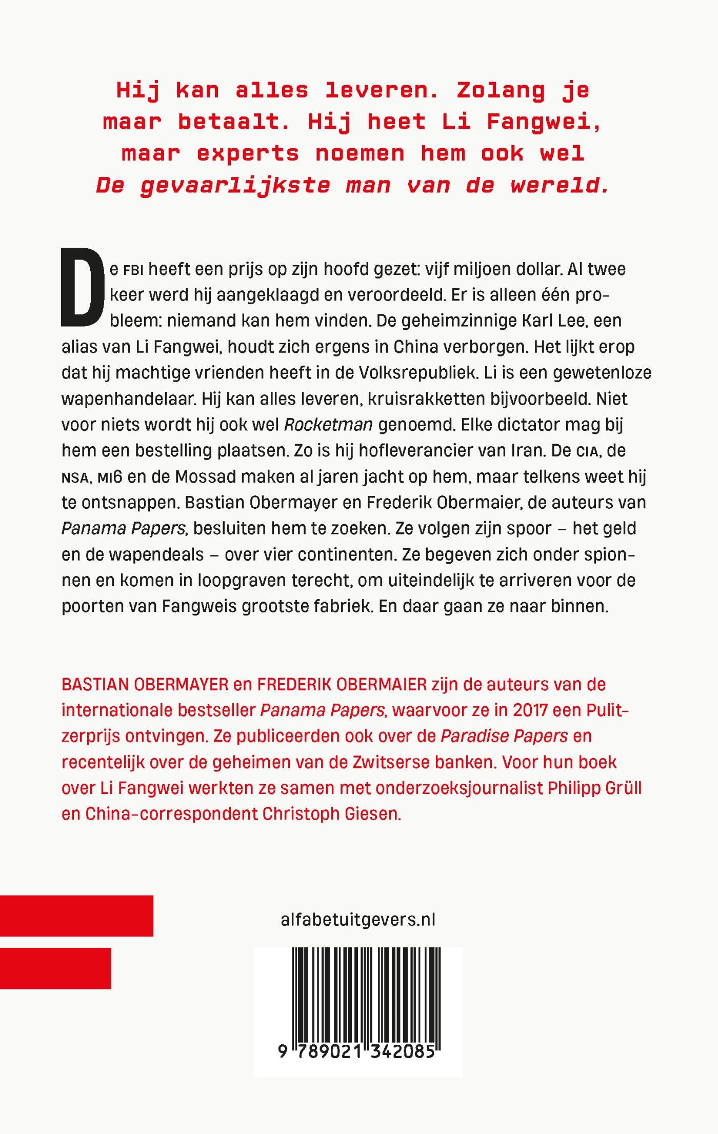 De FBI heeft een prijs op zijn hoofd gezet: vijf miljoen dollar. Al twee keer werd hij aangeklaagd en veroordeeld. Er is alleen één probleem: niemand kan hem vinden. De geheimzinnige Karl Lee, een alias van Li Fangwei, houdt zich ergens in China verborgen. Het lijkt erop dat hij machtige vrienden heeft in de Volks republiek. Li is een gewetenloze wapenhandelaar. Hij kan alles leveren, kruisraketten bijvoorbeeld. Niet voor niets wordt hij ook wel Rocketman genoemd. Elke dictator mag bij hem een bestelling plaatsen. Zo is hij hofleverancier van Iran. De CIA, de NSA, MI6 en de Mossad maken al jaren jacht op hem, maar telkens weet hij te ontsnappen. Bastian Obermayer en Frederik Obermaier, de auteurs van ‘Panama Papers’, besluiten hem te zoeken. Ze volgen zijn spoor – het geld en de wapendeals – over vier continenten. Ze begeven zich onder spionnen en komen in loopgraven terecht, om uiteindelijk te arriveren voor de poorten van Fangweis grootste fabriek. En daar gaan ze naar binnen.