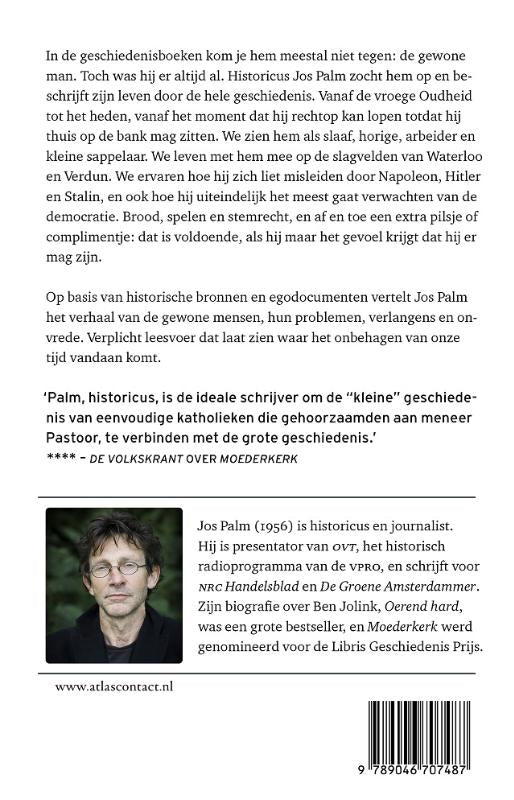 Op basis van historische bronnen en egodocumenten vertelt historicus Jos Palm in 'De gewone man' het verhaal van de kleine, gewone mensen, hun problemen, verlangens en onvrede. Want, in de geschiedenisboeken kom je hem meestal niet tegen: de gewone man. Toch was hij er altijd al. Palm zocht hem op en beschrijft zijn leven door de hele geschiedenis. Vanaf de vroege Oudheid tot het heden, vanaf het moment dat hij rechtop kan lopen totdat hij thuis op de bank mag zitten. We zien hem als slaaf, horige, arbeider en kleine sappelaar. We leven met hem mee op de slagvelden van Waterloo en Verdun. We ervaren hoe hij zich liet misleiden door Napoleon, Hitler en Stalin, en ook hoe hij uiteindelijk het meest gaat verwachten van de democratie. Brood, spelen en stemrecht, en af en toe een extra pilsje of complimentje: dat is voldoende, als hij maar het gevoel krijgt dat hij er mag zijn. Verplicht leesvoer dat laat zien waar het onbehagen van onze tijd vandaan komt.