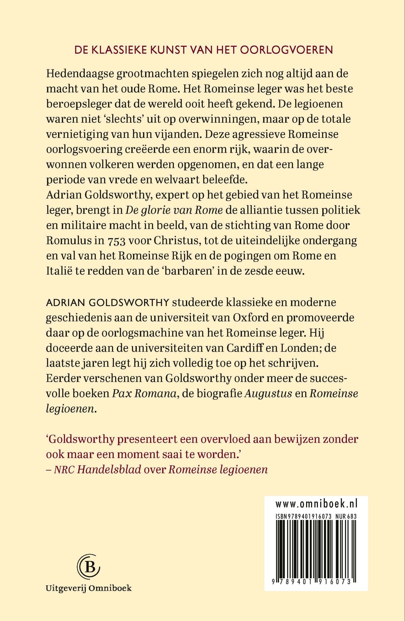 In 'De glorie van Rome' beschrijft bestsellerauteur Adrian Goldsworthy de werking en de invloed van het Romeinse leger, het beste beroepsleger dat de wereld ooit heeft gekend. De legioenen waren niet 'slechts' uit op de overwinning, maar ook op de totale vernietiging van hun vijanden. Deze agressieve Romeinse oorlogsvoering creëerde een enorm rijk, dat voor een groot deel gekenmerkt werd door vrede en welvaart. Goldsworthy brengt de alliantie tussen politiek en militaire macht in beeld. 'Als je ooit twee boeken over het Romeinse leger gaat lezen, laat dit dan één van die twee zijn,' aldus de Britse krant 'The Observer'.