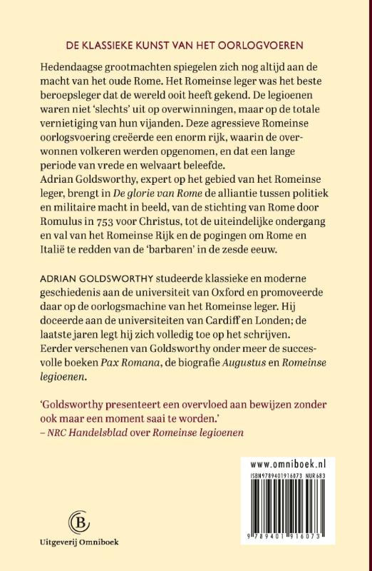 In 'De glorie van Rome' beschrijft bestsellerauteur Adrian Goldsworthy de werking en de invloed van het Romeinse leger, het beste beroepsleger dat de wereld ooit heeft gekend. De legioenen waren niet 'slechts' uit op de overwinning, maar ook op de totale vernietiging van hun vijanden. Deze agressieve Romeinse oorlogsvoering creëerde een enorm rijk, dat voor een groot deel gekenmerkt werd door vrede en welvaart. Goldsworthy brengt de alliantie tussen politiek en militaire macht in beeld. 'Als je ooit twee boeken over het Romeinse leger gaat lezen, laat dit dan één van die twee zijn,' aldus de Britse krant 'The Observer'.