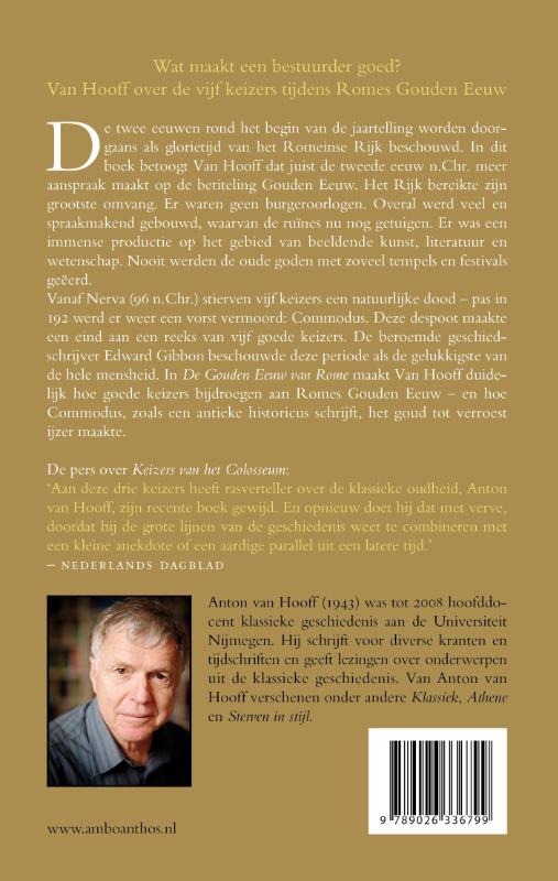 Vanaf Nerva (96 n.C.) stierven vijf keizers in hun bed – pas in 192 werd er weer een vorst vermoord: Commodus. Deze despoot brak de reeks van vijf goede keizers af. De beroemde geschiedschrijver Edward Gibbon beschouwde die tijd als de gelukkigste periode van de hele mensheid. In De Gouden Eeuw van Rome maakt Van Hooff duidelijk hoe goede keizers bijdroegen aan Romes Gouden Eeuw – en hoe Commodus, zoals een antieke historicus schrijft, het goud tot verroest ijzer maakte.