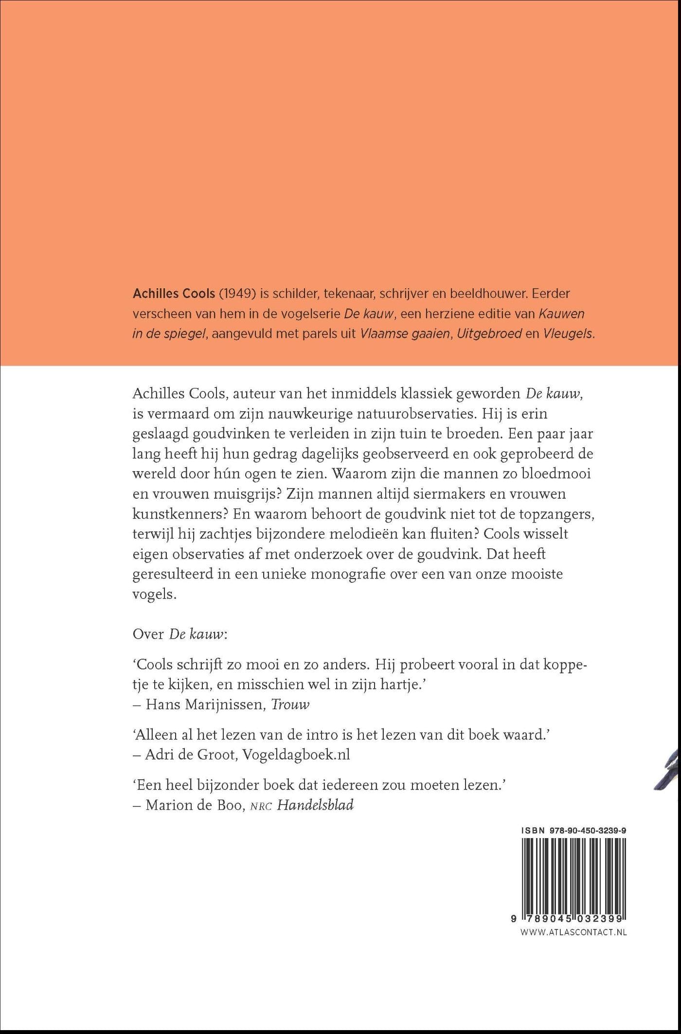 Achilles Cools, auteur van het inmiddels klassiek geworden De kauw, is vermaard om zijn nauwkeurige natuurobservaties. Hij is erin geslaagd goudvinken te verleiden in zijn tuin te broeden. Een paar jaar lang heeft hij hun gedrag dagelijks geobserveerd en ook geprobeerd de wereld door hún ogen te zien. Waarom zijn die mannen zo bloedmooi en vrouwen muisgrijs? Zijn mannen altijd siermakers en vrouwen kunstkenners? En waarom behoort de goudvink niet tot de topzangers, terwijl hij zachtjes bijzondere melodieën kan fluiten? Cools wisselt eigen observaties af met onderzoek over de goudvink. Dat heeft geresulteerd in een unieke monografie over een van onze mooiste vogels.