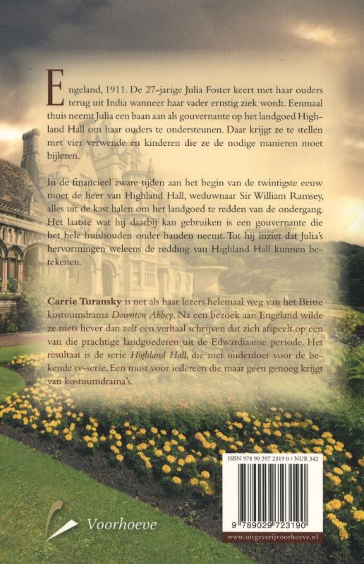 In de financieel zware tijden moet de heer van Highland Hall, weduwnaar Sir William Ramsey, alles uit de kast halen om het landgoed te redden van de ondergang. Het laatste wat hij nodig heeft is een gouvernante die het hele huishouden onder handen neemt. Tot hij inziet dat Julia s hervormingen wel eens de redding van Highland Hall kunnen betekenen. Carrie Turansky is net als haar lezers helemaal weg van het Britse kostuumdrama Downton Abbey. Na een bezoek aan Engeland wilde ze niets liever dan zelf een verhaal schrijven dat zich afspeelt op een van die prachtige landgoederen uit de Edwardiaanse periode. Het resultaat is de serie Highland Hall, voor iedereen die maar geen genoeg krijgt van kostuumdrama s.