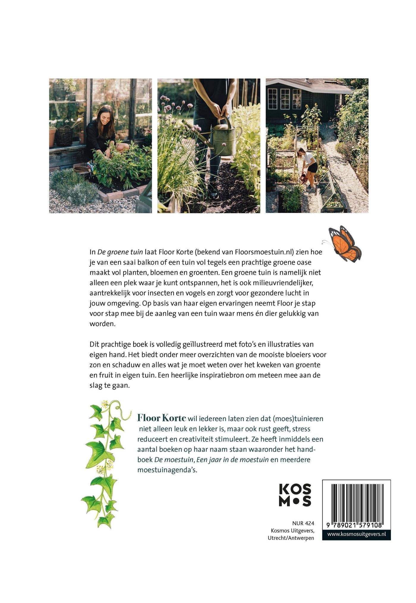 Na het succesvolle boek ‘De moestuin’, laat Floor Korte (bekend van Floorsmoestuin.nl) in ‘De groene tuin’ zien hoe je van een saai balkon of een tuin vol tegels een prachtige groene plek maakt. Op basis van haar eigen ervaringen, neemt ze je stap voor stap mee bij het aanleggen van een tuin waar mens én dier gelukkig van worden. Want hoe bouw je een schuurtje of een insectenhotel? En welke planten doen het goed op welke plek? Ze vertelt over de mooiste bloeiers, het kweken van groente en fruit in eigen tuin en het belang van insecten. Volledig geïllustreerd met veel foto’s en illustraties is dit een prachtig en inspirerend boek om mee aan de slag te gaan.