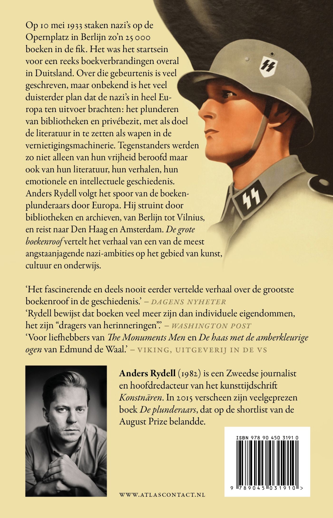 In 'De grote boekenroof' vertelt Anders Rydell het onbekende verhaal van een grootschalige plundercampagne van bibliotheken en privécollecties door de nazi's om zo de literatuur in te kunnen zetten als wapen in de vernietigingsmachinerie. Tegenstanders werden zo niet alleen van hun vrijheid beroofd maar ook van hun literatuur, hun verhalen, hun emotionele en intellectuele geschiedenis. Rydell volgt het spoor van de boekenplunderaars door Europa. Hij struint door bibliotheken en archieven, van Berlijn tot Vilnius, en reist naar Den Haag en Amsterdam. 'De grote boekenroof' vertelt het verhaal van een van de meest angstaanjagende nazi-ambities op het gebied van kunst, cultuur en onderwijs