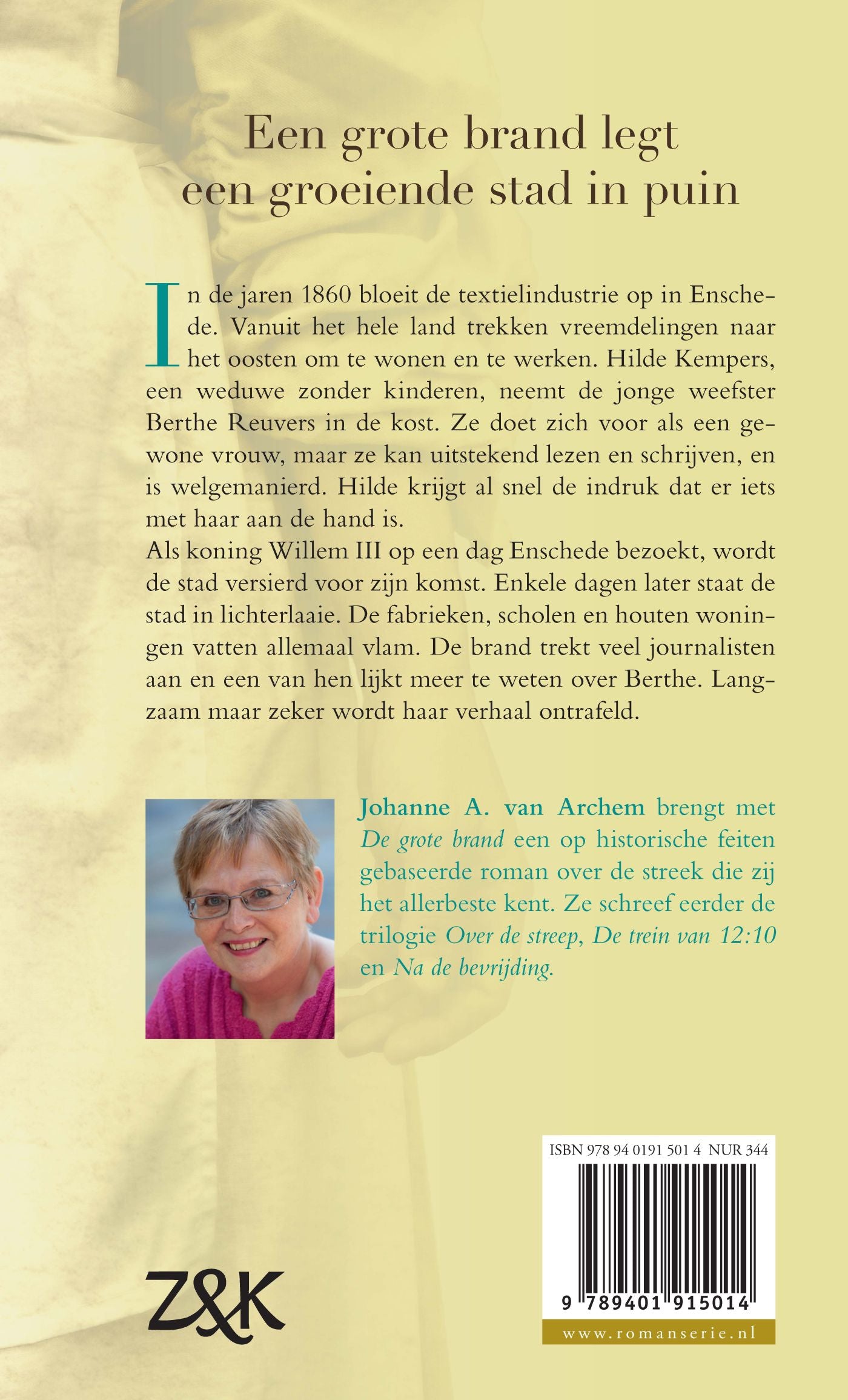 ‘De grote brand’ van Johanne A. van Archem speelt zich af in het Enschede van de jaren 1860. Er komen veel vreemdelingen naar de dan nog kleine stad om te gaan werken in de textielindustrie. Hilde Kempers, een weduwe zonder kinderen, neemt Berthe Reuvers in de kost. Ze heeft al snel de indruk dat er iets met Berthe aan de hand is. Dan staat op een dag de stad in lichterlaaie en moet vrijwel iedereen opnieuw beginnen. Langzaam maar zeker wordt duidelijker wat het verhaal van Berthe is. Johanne A. van Archem schreef met ‘De grote brand’ een op historische feiten gebaseerde roman over de streek die zij het allerbest kent.
