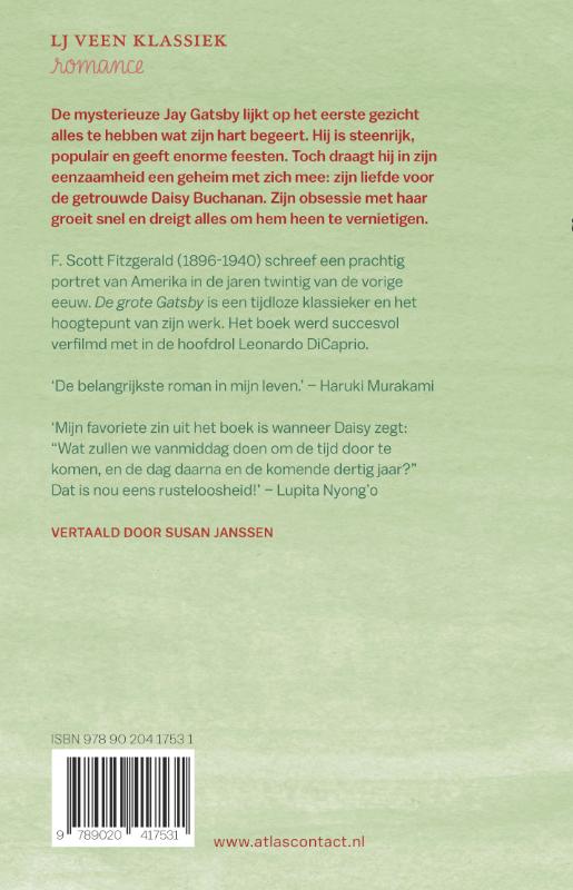 De grote Gatsby is het hoogtepunt uit het oeuvre van F. Scott Fitzgerald (1896-1940), en een schitterend geschreven portret van Amerika in de jaren twintig van de vorige eeuw.