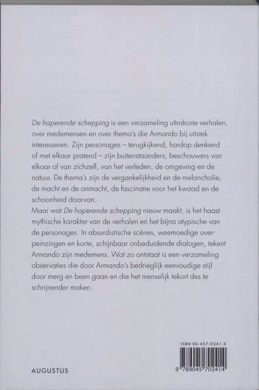 De haperende schepping is een verzameling ultrakorte verhalen, over medemensen en over thema’s die Armando bij uitstek interesseren. Zijn personages – terugkijkend, hardop denkend of met elkaar pratend – zijn buitenstaanders; beschouwers van elkaar of van zichzelf, van het verleden, de omgeving en de natuur. De thema’s zijn de vergankelijkheid en de melancholie, de macht en de onmacht, de fascinatie voor het kwaad en de schoonheid daarvan. Maar wat De haperende schepping nieuw maakt, is het haast mythische karakter van de verhalen en het bijna a-typische van de personages. In absurdistische scènes, weemoedige overpeinzingen en korte, schijnbaar onbeduidende dialogen, tekent Armando zijn medemens. Wat zo ontstaat is een verzameling observaties die door Armando’s bedrieglijk eenvoudige stijl door merg en been gaan en die het menselijk tekort des te schrijnender maken.