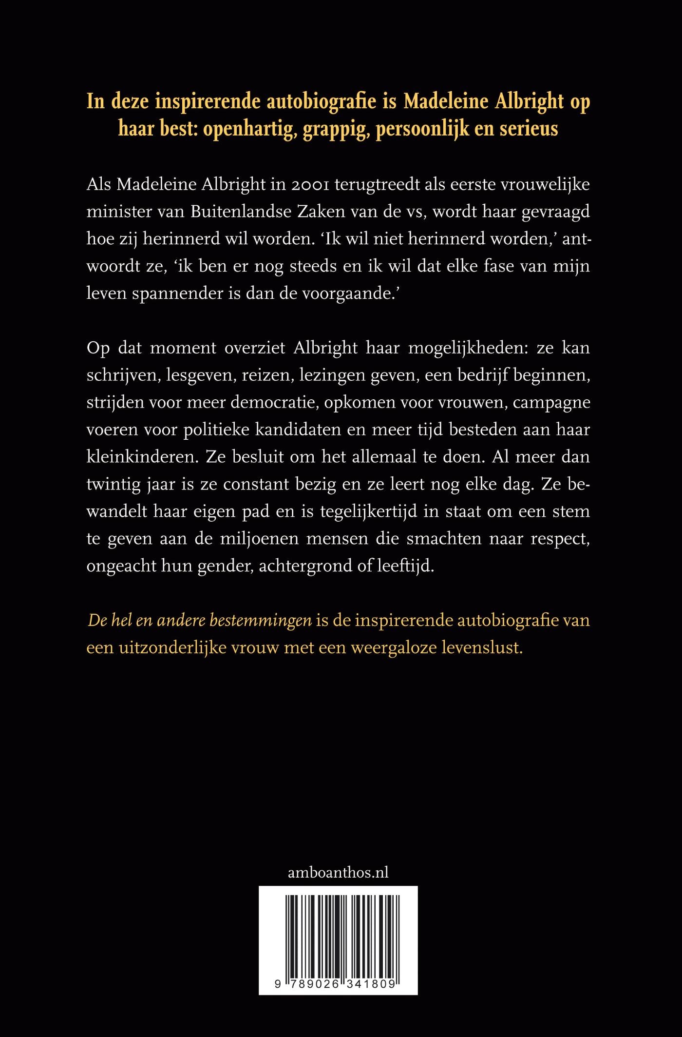 De hel en andere bestemmingen van Madeleine Albright is de inspirerende autobiografie van een uitzonderlijke vrouw met een weergaloze levenslust. Madeleine Albright op haar best: openhartig, grappig, persoonlijk en serieus. Lees ook Albrights eerdere autobiografische boeken Praagse winter en Mevrouw de minister.