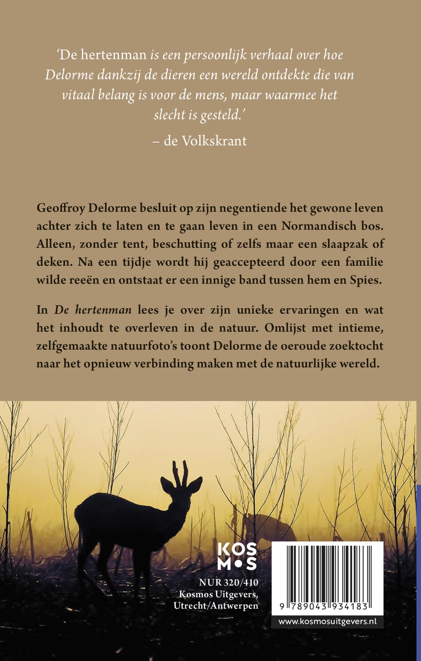 Op zijn negentiende besluit Geoffroy Delorme het gewone leven achter zich te laten en zeven jaar door te brengen in een Normandisch bos. Alleen, zonder tent, beschutting of zelfs maar een slaapzak of deken. Na een tijdje wordt hij geaccepteerd door een familie wilde reeën en ontstaat er een innige band tussen hem en Spies, een van de dieren. In De hertenman lees je over zijn unieke ervaringen en wat het inhoudt te overleven in de natuur. Omlijst met intieme, zelfgemaakte natuurfoto’s toont Geoffroy ons de oeroude zoektocht om opnieuw verbinding te maken met de natuurlijke wereld. Voor de liefhebbers en lezers van o.a. Miriam Lancewood, Tamar Valkenier, Into the Wild en Peter Wohlleben.