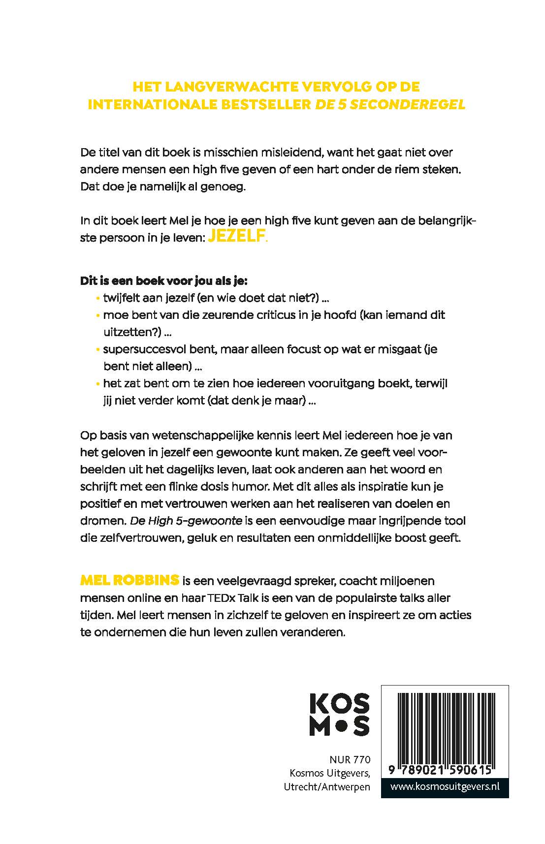 De High 5-gewoonte van Mel Robbins is het langverwachte vervolg op haar internationale bestseller De 5 seconderegel. Op basis van wetenschappelijke feiten leert Mel iedereen hoe je van het geloven in jezelf een gewoonte kunt maken. Zo kun je met vertrouwen werken aan het realiseren van doelen en dromen. De High 5-gewoonte is een eenvoudige maar ingrijpende tool die zelfvertrouwen, geluk en resultaten een onmiddellijke boost geeft.