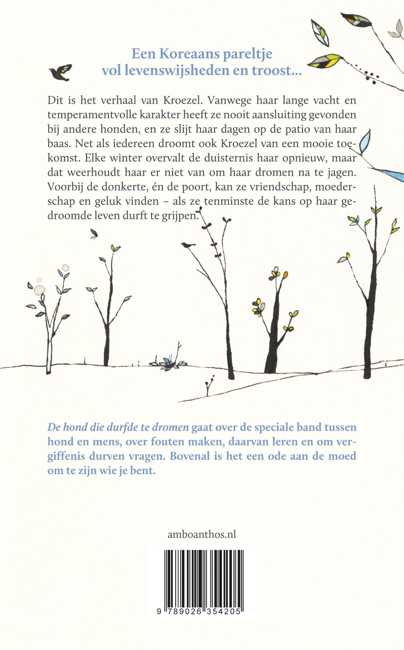 Sun-mi Hwang, bekend van Het huis met de kersenbloesem, vertelt in De hond die durfde te dromen het verhaal van Kroezel. Vanwege haar lange vacht en temperamentvolle karakter heeft ze nooit aansluiting gevonden bij andere honden, en ze slijt haar dagen op de patio van haar baas. Net als iedereen droomt ook Kroezel van een mooie toekomst. Elke winter overvalt de duisternis haar opnieuw, maar dat weerhoudt haar er niet van om haar dromen na te jagen. Voorbij de donkerte, én de poort, kan ze vriendschap, moederschap en geluk vinden – als ze tenminste de kans op haar gedroomde leven durft te grijpen.