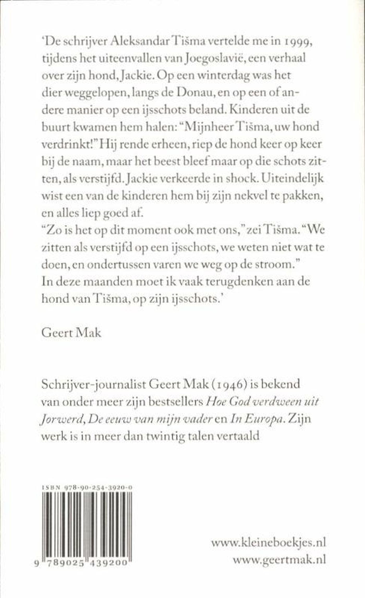 'De schrijver Aleksandar Tisma vertelde me in 1999, tijdens het uiteenvallen van Joegoslavië, een verhaal over zijn hond, Jackie. Op een winterdag was het dier weggelopen, langs de Donau, en op een of andere manier was het op een ijsschots beland. Kinderen uit de buurt kwamen hem halen: 'Mijnheer Tisma, uw hond verdrinkt!' Hij rende erheen, riep de hond keer op keer bij de naam, maar Jackie bleef maar op die schots zitten, als verstijfd. Het beest verkeerde in een complete shock. Uiteindelijk wist een van de kinderen hem bij zijn nekvel te pakken, en alles liep goed af. 'Zo is het op dit moment ook met ons,' zei Tisma. 'We zitten als verstijfd op een ijsschots, we weten niet wat te doen, en ondertussen zeilen we weg op de stroom. In deze maanden moet ik vaak terugdenken aan de hond van Tisma, op zijn ijsschots. Historische gebeurtenissen worden door degenen die ze meemaken slechts zelden als historisch beleefd. Dat is maar goed ook, want zonder de rust van onze alledaagse beslommeringen zouden we allemaal gek worden van zorg en zenuwen. Het liefst blijven we maar doorlopen, als een kip zonder kop, eeuwig in onze vaste paden. Het Wenen van 1914 was ook zo'n wereld van zekerheden, een wereld die zich eeuwig leek voort te zetten, en toch was het allemaal opeens voorbij, voorgoed. Het gevaar is groot dat ons hetzelfde gebeurt. Dat het hele Europese project, dit kostbare erfgoed van de vorige generaties Europeanen, ongemerkt uit onze handen glipt. En dat daarmee ook onze wereld van vanzelfsprekendheden plotseling in stukken valt.'