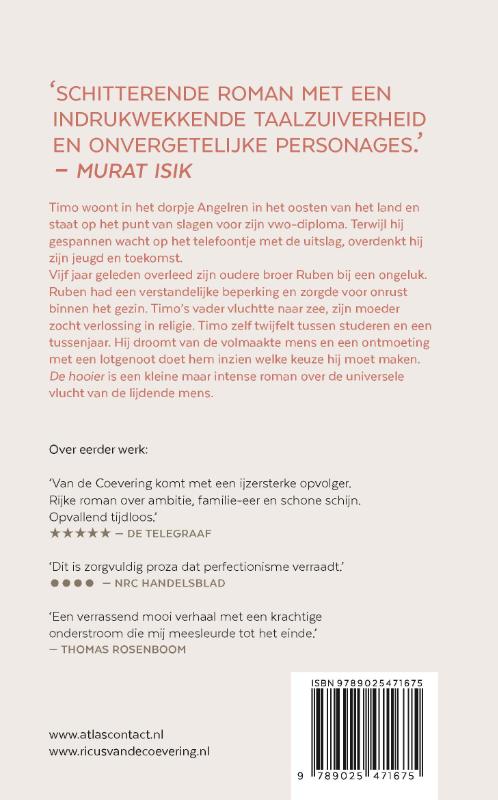 ‘De hooier’ van Ricus van de Coevering gaat over Timo, wonend in het dorpje Angelren in het oosten van het land en op het punt van slagen voor zijn vwo-diploma. Terwijl hij gespannen wacht op het telefoontje met de uitslag, overdenkt hij zijn jeugd en toekomst.