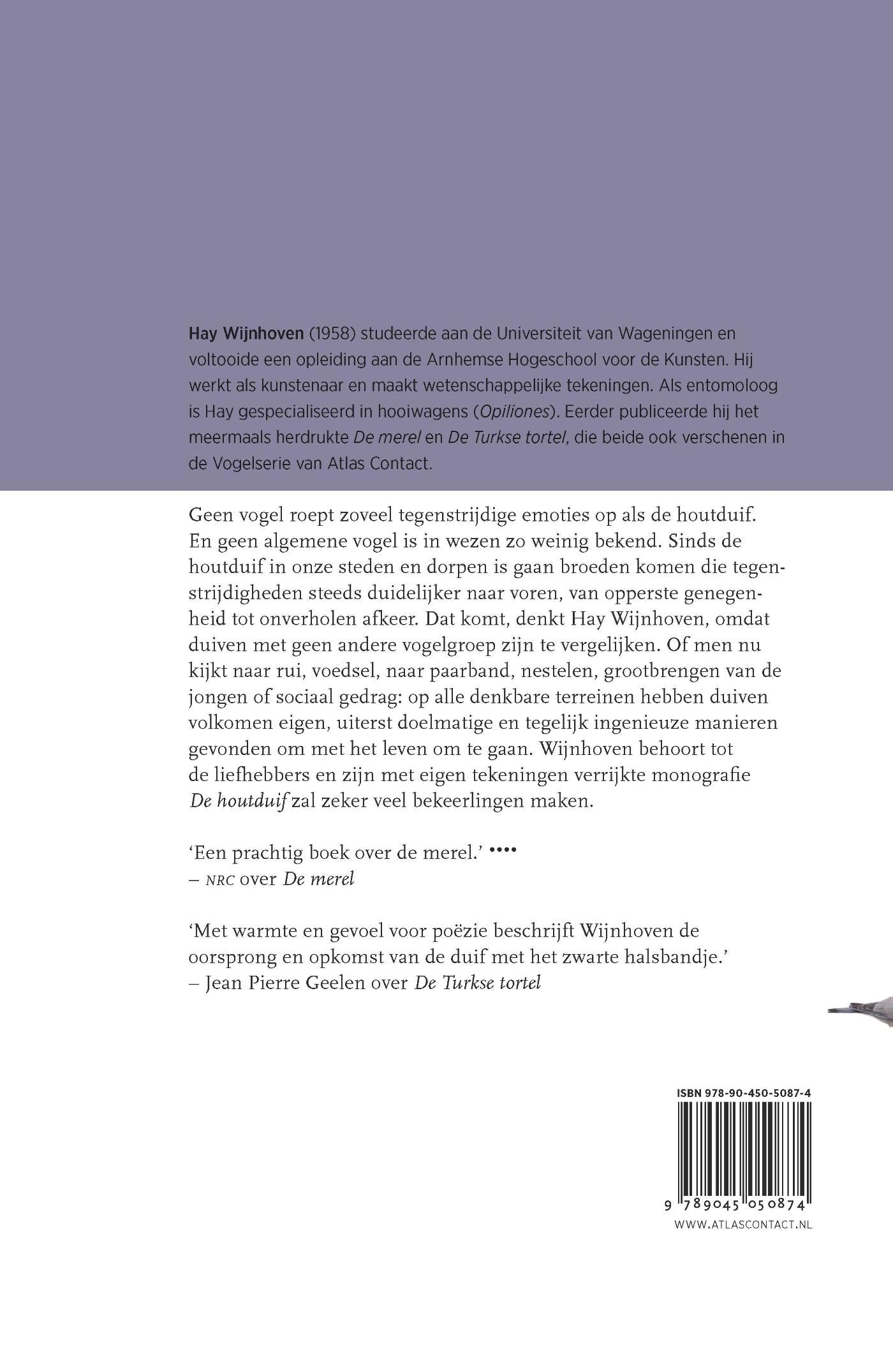 Geen vogel roept zoveel tegenstrijdige emoties op als de houtduif. En geen algemene vogel is in wezen zo weinig bekend. Sinds de houtduif in onze steden en dorpen is gaan broeden komen die tegenstrijdigheden steeds duidelijker naar voren, van opperste genegenheid tot onverholen afkeer. Dat komt, denkt Hay Wijnhoven, omdat duiven met geen andere vogelgroep zijn te vergelijken. Of men nu kijkt naar rui, voedsel, naar paarband, nestelen, grootbrengen van de jongen of sociaal gedrag: op alle denkbare terreinen hebben duiven volkomen eigen, uiterst doelmatige en tegelijk ingenieuze manieren gevonden om met het leven om te gaan. Wijnhoven behoort tot de liefhebbers en zijn met eigen tekeningen verrijkte monografie De houtduif zal zeker veel bekeerlingen maken.
