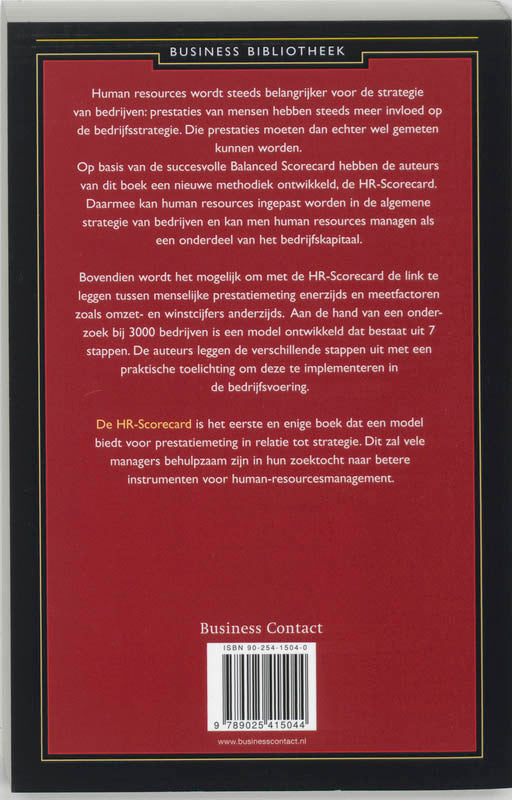 Prestaties van mensen hebben steeds meer invloed op de bedrijfsstrategie. Die prestaties moeten dan wel gemeten kunnen worden. Op basis van de succesvolle Balanced Scorecard hebben de auteurs van dit boek een nieuwe methodiek ontwikkeld, de HR-scorecard. Daarmee kan human resources management ingepast worden in de algemene strategie van bedrijven en kan men human resources managen als een onderdeel van het bedrijfskapitaal. Bovendien wordt het mogelijk om met de HR-scorecard een koppeling te maken tussen menselijke prestatiemeting enerzijds en meetfactoren zoals omzet- en winstcijfers anderzijds. Aan de hand van een onderzoek bij 3000 bedrijven hebben de auteurs een model ontwikkeld dat bestaat uit 7 stappen. Zij beschrijven uitgebreid de verschillende stappen met een praktische toelichting hoe deze kunnen worden geïmplementeerd in de bedrijfsvoering. 'De HR-scorecard' is daarmee een boek dat een model neerlegt voor prestatiemeting in relatie tot strategie. Dit zal vele managers behulpzaam zijn in hun zoektocht naar betere instrumenten voor human-resources-management.