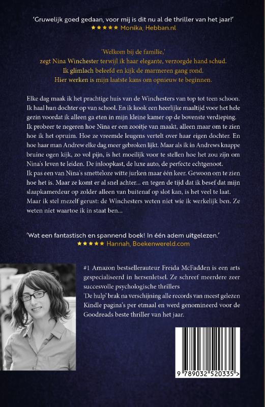 'Welkom bij de familie,' zegt Nina Winchester terwijl ik haar elegante, verzorgde hand schud. Ik glimlach beleefd en kijk de marmeren gang rond. Hier werken is mijn laatste kans om opnieuw te beginnen. Maar ik zal snel ontdekken dat de geheimen van de Winchesters veel gevaarlijker zijn dan de mijne...Elke dag maak ik het prachtige huis van de Winchesters van top tot teen schoon. Ik haal hun dochter op van school. En ik kook een heerlijke maaltijd voor het hele gezin voordat ik alleen ga eten in mijn kleine kamer op de bovenste verdieping.Ik probeer te negeren hoe Nina er een zooitje van maakt, alleen maar om te zien hoe ik het opruim. Hoe ze vreemde leugens vertelt over haar eigen dochter. En hoe haar man Andrew elke dag meer gebroken lijkt. Maar als ik in Andrews knappe bruine ogen kijk, zo vol pijn, is het moeilijk voor te stellen hoe het zou zijn om Nina's leven te leiden. De inloopkast, de luxe auto, de perfecte echtgenoot.Ik pas een van Nina's smetteloze witte jurken maar één keer. Gewoon om te zien hoe het is. Maar ze komt er al snel achter... en tegen de tijd dat ik besef dat mijn slaapkamerdeur op zolder alleen van buitenaf op slot kan, is het veel te laat.Maar ik stel mezelf gerust: de Winchesters weten niet wie ik werkelijk ben.Ze weten niet waartoe ik in staat ben...