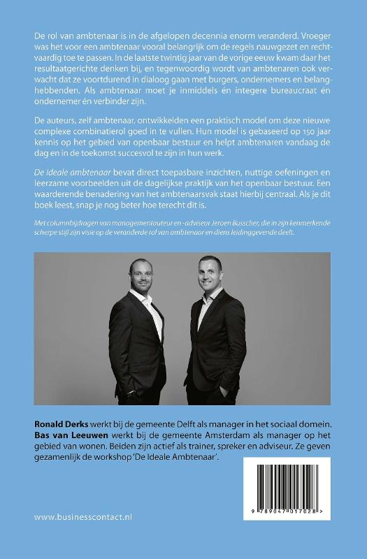 Ronald Derks en Bas van Leeuwen beschrijven in ‘De ideale ambtenaar’ hoe de rol van ambtenaar in de afgelopen decennia enorm is veranderd. Vroeger was het voor een ambtenaar vooral belangrijk om de regels nauwgezet en rechtvaardig toe te passen. In de laatste twintig jaar van de vorige eeuw kwam daar het resultaatgerichte denken bij, en tegenwoordig wordt van ambtenaren ook verwacht dat ze voortdurend in dialoog gaan met burgers, ondernemers en belanghebbenden. Als ambtenaar moet je inmiddels een integere bureaucraat én ondernemer én verbinder zijn. De auteurs, zelf ambtenaar, ontwikkelden een praktisch model om deze nieuwe complexe combinatierol goed in te vullen. Hun model is gebaseerd op 150 jaar kennis op het gebied van openbaar bestuur en helpt ambtenaren vandaag de dag en in de toekomst succesvol te zijn in hun werk.