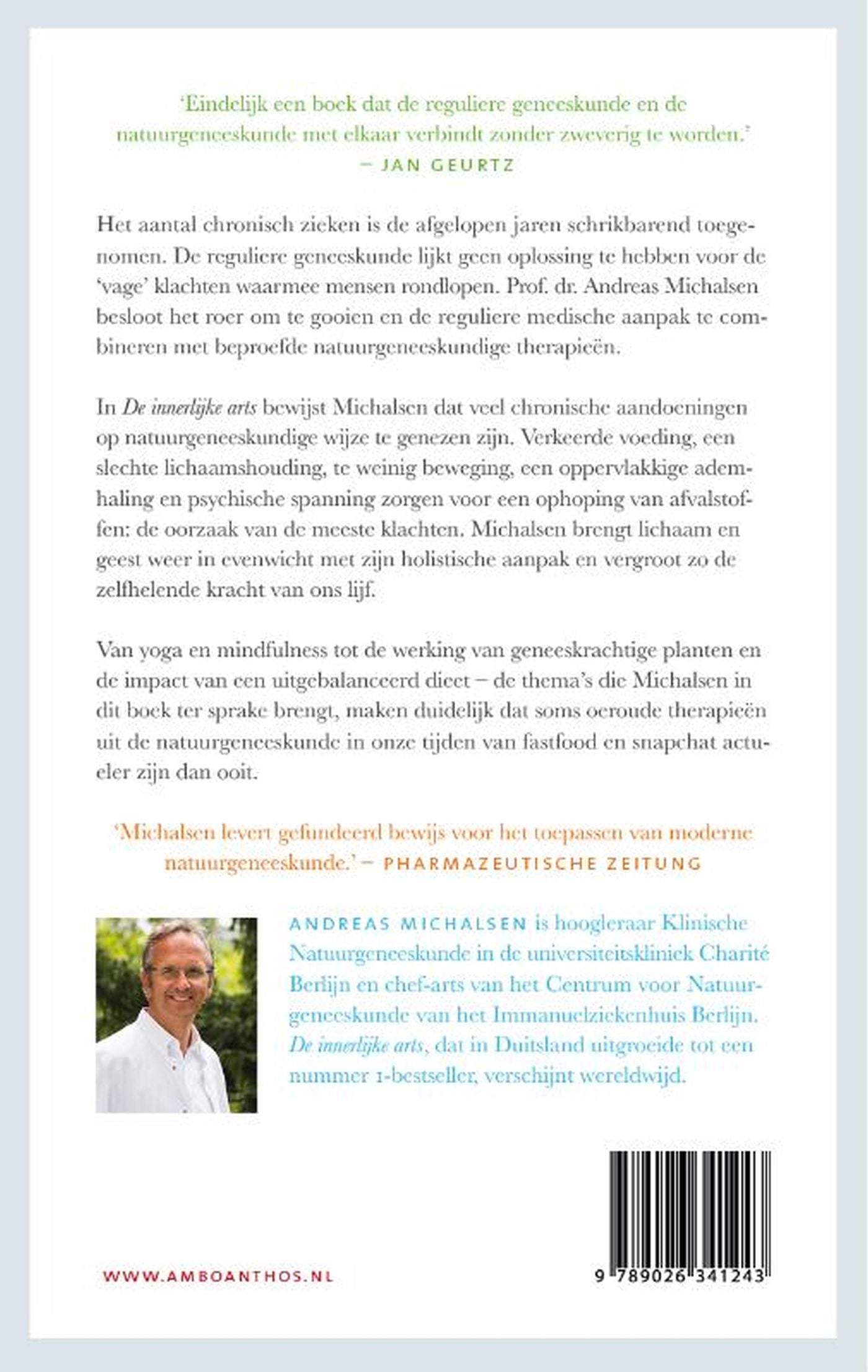 In ‘De innerlijke arts’ bewijst prof. dr. Andreas Michalsen dat veel chronische aandoeningen met moderne natuurgeneeskundige therapieën te genezen zijn. De meeste klachten kennen dezelfde oorzaak: een ophoping van afvalstoffen in het menselijk lichaam. Verkeerde voeding, een slechte lichaamshouding, te weinig beweging, een onvolledige ademhaling en psychische spanningen liggen hieraan meestal ten grondslag. Michalsen brengt in ‘De innerlijke arts’ lichaam en geest weer in evenwicht met zijn holistische aanpak en vergroot zo de zelfhelende kracht van het lichaam. ‘Michalsen levert gefundeerd bewijs voor het toepassen van moderne natuurgeneeskunde.’ – Pharmazeutische Zeitung