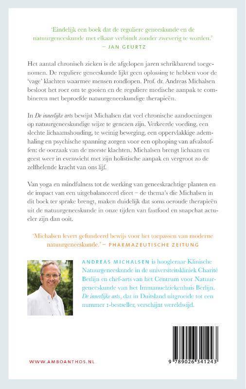 Natuurlijk genezen voor een optimale gezondheid van lichaam en geest, voor lezers van 'De huid' en 'De voedselzandloper'. In 'De innerlijke arts' bewijst prof. dr. Andreas Michalsen dat veel chronische aandoeningen met moderne natuurgeneeskundige therapieën te genezen zijn. De meeste klachten kennen dezelfde oorzaak: een ophoping van afvalstoffen in het menselijk lichaam. Verkeerde voeding, een slechte lichaamshouding, te weinig beweging, een onvolledige ademhaling en psychische spanningen liggen hieraan meestal ten grondslag. Michalsen brengt in 'De innerlijke arts' lichaam en geest weer in evenwicht met zijn holistische aanpak en vergroot zo de zelfhelende kracht van het lichaam.