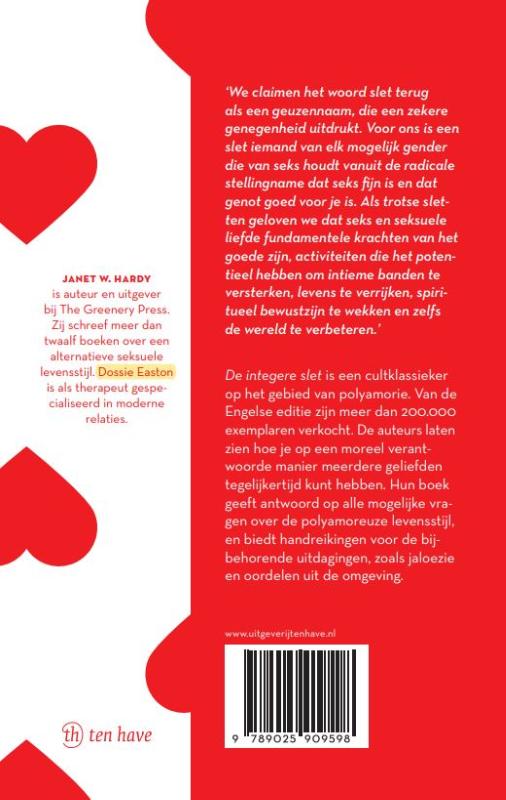 'De integere slet' is een cultklassieker op het gebied van polyamorie. Van de Engelse editie zijn meer dan 200.000 exemplaren verkocht. De auteurs laten zien hoe je op een moreel verantwoorde manier meerdere geliefden tegelijkertijd kunt hebben. Hun boek geeft antwoord op alle mogelijke vragen over de polyamoreuze levensstijl, en biedt handreikingen voor de bijbehorende uitdagingen, zoals jaloezie en oordelen uit de omgeving.