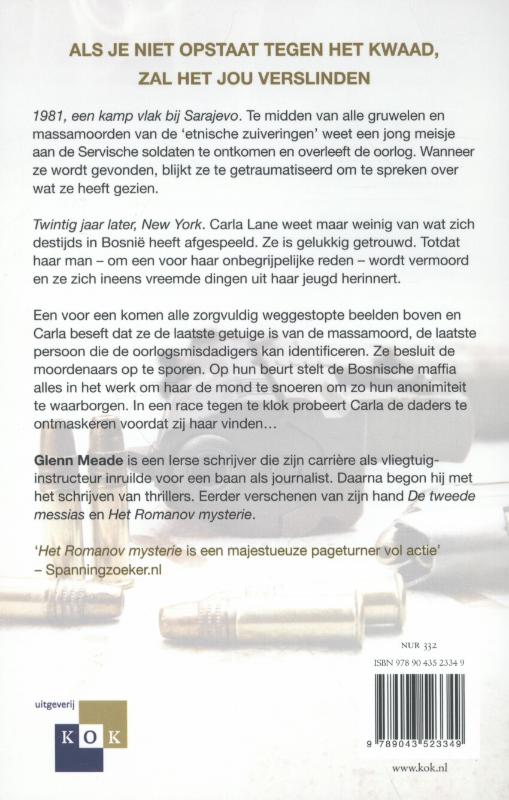 Twintig jaar later. Carla Lane weet maar weinig van wat zich destijds in Bosnië afspeelde. Ze leidt een gelukkig leven in New York. Totdat haar man om onbegrijpelijke redenen wordt vermoord en ze zich ineens vreemde dingen uit haar jeugd herinnert. Langzaam komen alle zorgvuldig weggestopte herinneringen terug en Carla beseft dat ze de laatste getuige is van de massamoord, de laatste persoon die de verantwoordelijke oorlogsmisdadigers kan ontmaskeren. Ze besluit de misdadigers op te sporen. Tenminste, als zij haar niet eerst vinden.
