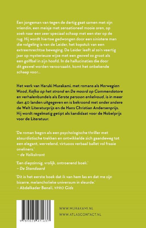 In ‘De jacht op het verloren schaap’ van Haruki Murakami gaat een jongeman van tegen de dertig samen met zijn vriendin, een meisje met sensationeel mooie oren, op zoek naar een zeer speciaal schaap met een ster op de rug. Hij wordt hiertoe gedwongen door een sinistere man die volgeling is van de Leider, het kopstuk van een extreemrechtse beweging. De Leider leeft al zo’n veertig jaar op mysterieuze wijze met een gezwel zo groot als een golfbal in zijn hoofd. In de hallucinaties die door dit gezwel worden veroorzaakt, komt het onbekende schaap voor...
