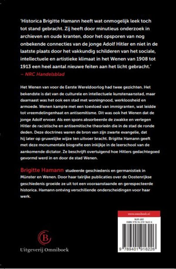 ‘De jonge Adolf’ van Brigitte Hamann is een monumentale biografie over de jonge Adolf Hitler en geeft daarnaast een uitstekend beeld van de kunstenaarsstad Wenen tussen 1907 en 1913. De zwakke en verlegen voorman van de nationaalsocialisten vond in Wenen de bron van zijn zwarte evangelie. In de stad deden verschillende racistische en antisemitische theorieën de ronde en Hitler absorbeerde deze als een spons. Langzaam maar zeker veranderde hijzelf en zijn kijk op de wereld. Na de Eerste Wereldoorlog verschijnt een andere Hitler ten tonele. Historica Brigitte Hamann geeft met ‘De jonge Adolf’ een interessant inkijkje in de leerschool van de aankomende dictator.