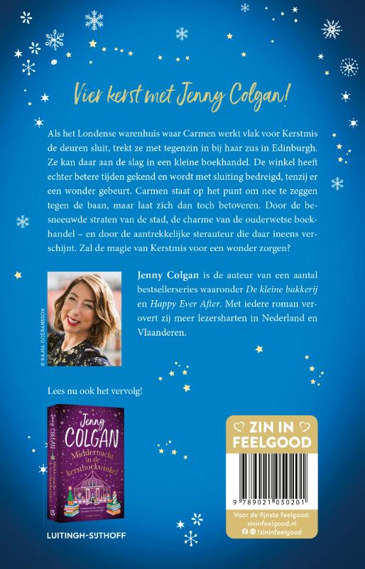 In De kerstboekwinkel van Jenny Colgan wacht Carmen een grote uitdaging. Als het Londense warenhuis waar zij werkt vlak voor Kerstmis de deuren sluit, trekt ze met tegenzin in bij haar zus in Edinburgh. Ze kan daar aan de slag in een kleine boekhandel. De winkel heeft echter betere tijden gekend en wordt met sluiting bedreigd – tenzij er een wonder gebeurt. Carmen staat op het punt om nee te zeggen tegen de baan, maar laat zich dan toch betoveren: door de besneeuwde straten van de stad, door de charme van de ouderwetse boekhandel – en door de aantrekkelijke sterauteur die daar ineens verschijnt. Zal de magie van Kerstmis voor een wonder zorgen?