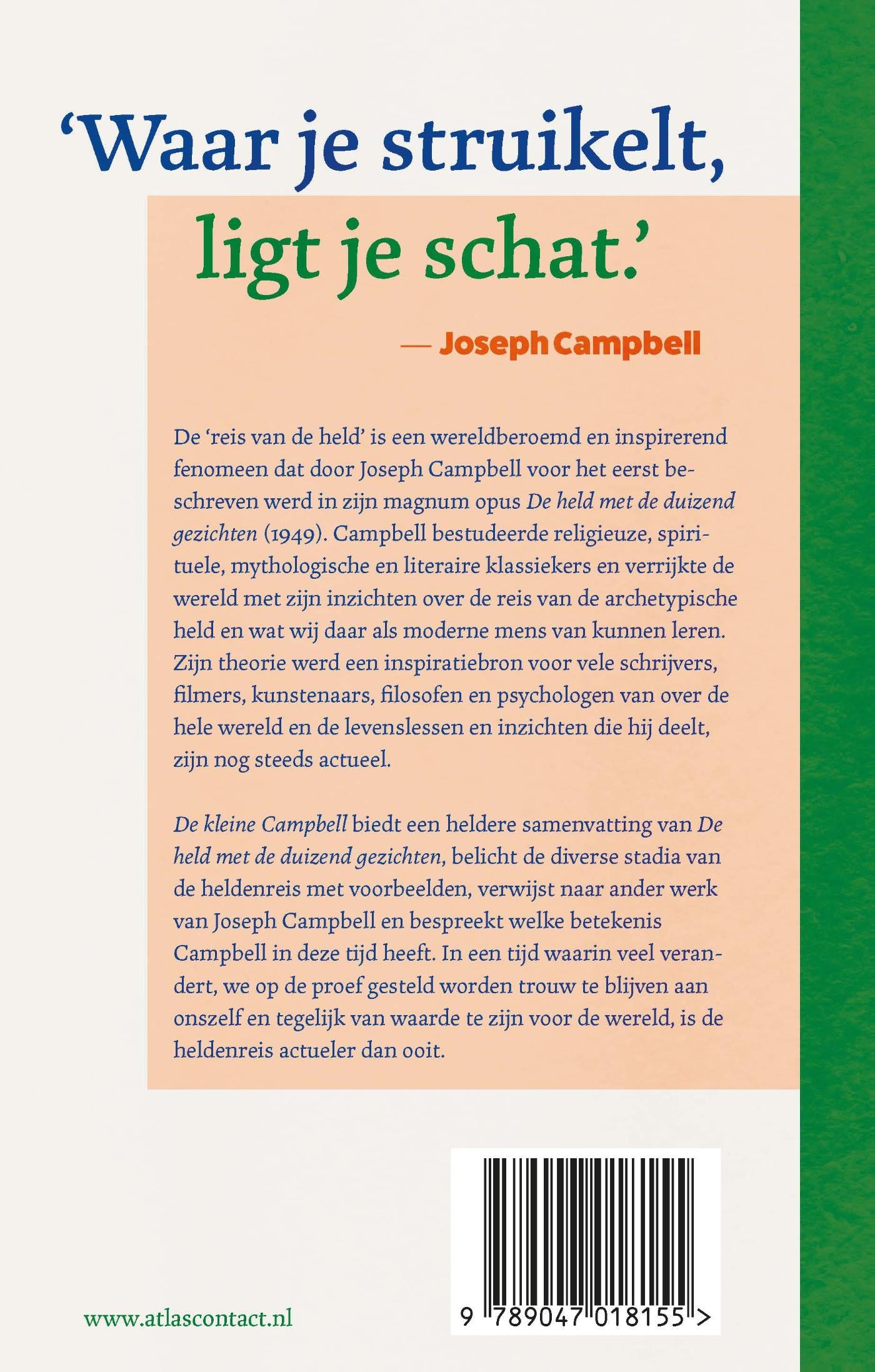 ‘De kleine Campbell’ biedt een heldere samenvatting van ‘De held met de duizend gezichten’, het beroemde boek van Campbell uit 1949. Joseph Campbell bestudeerde religieuze, spirituele, mythologische en literaire klassiekers en verrijkte de wereld met zijn inzichten over ‘de reis van de held’ en wat wij daar als moderne mens van kunnen leren. Zijn theorie werd een inspiratiebron voor vele schrijvers, filmers, kunstenaars, filosofen en psychologen van over de hele wereld en de levenslessen en inzichten die hij deelt, zijn nog steeds actueel.